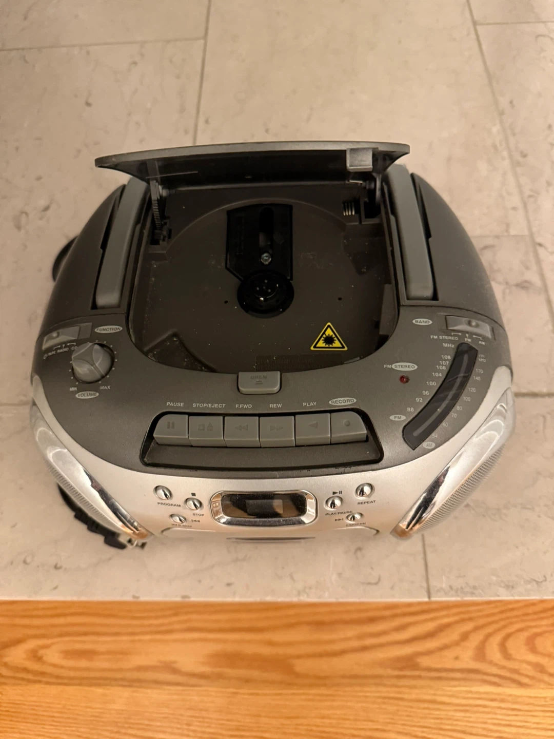 Selling a Koss boombox with a CD player and radio. It has a handle for easy carrying and a simple design with buttons for play, pause, stop, rewind, and fast forward. It also features a digital filter processed compact disc player. Smoke free home. Cash only. Please pick up in Mississauga. All sales final and bundle offers are welcome. A freebie is included with every purchase!