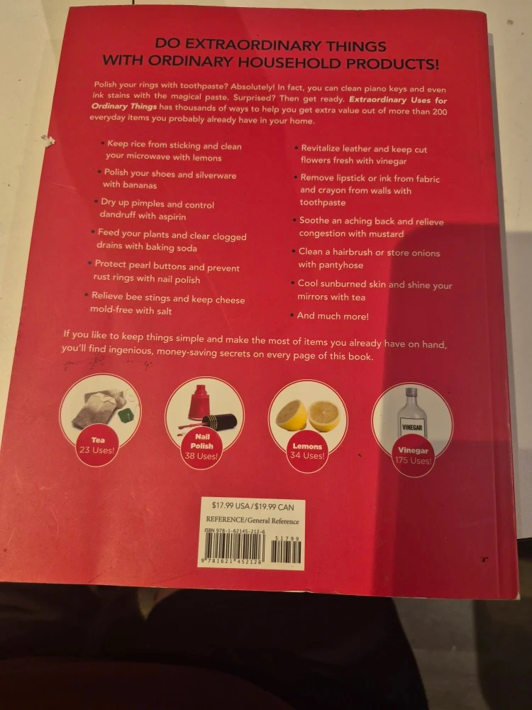 Selling a copy of "Extraordinary Uses for Ordinary Things" by Reader's Digest! It's full of clever ideas for using everyday household items. Did you know you can polish your shoes with bananas or clean your microwave with lemons? This book is packed with 2,317 ingenious uses for vinegar, salt, coffee grounds, and much more!
