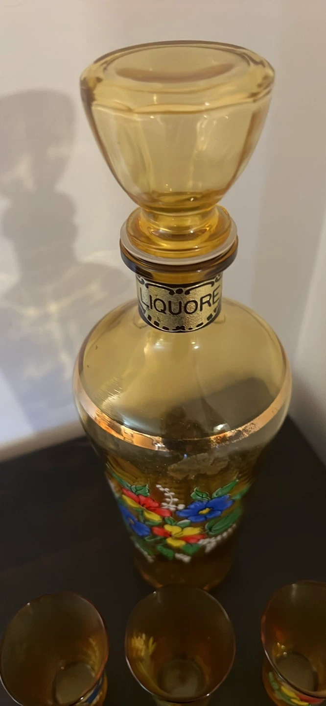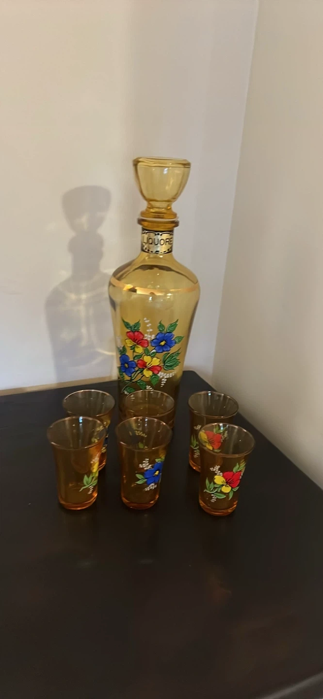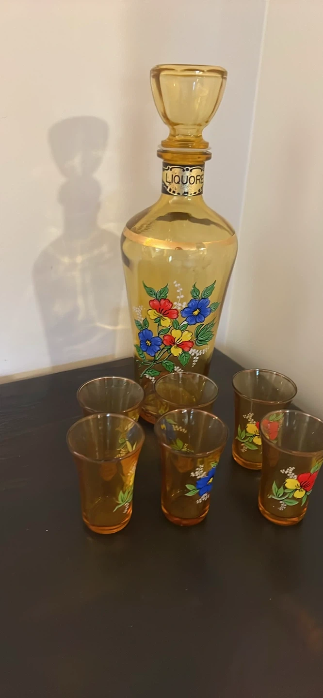 Here's a charming vintage liqueur decanter set! It comes with the decanter and six matching glasses. The set features a lovely floral design. Perfect for adding a touch of vintage elegance to your home bar or collection