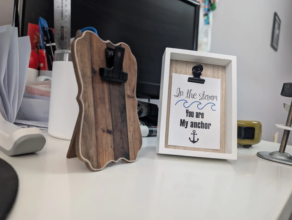 Two cute clip frames for displaying photos or notes! One is a wooden frame with a wood-look backing, and the other is a white frame with an "In the storm, you are my anchor" print