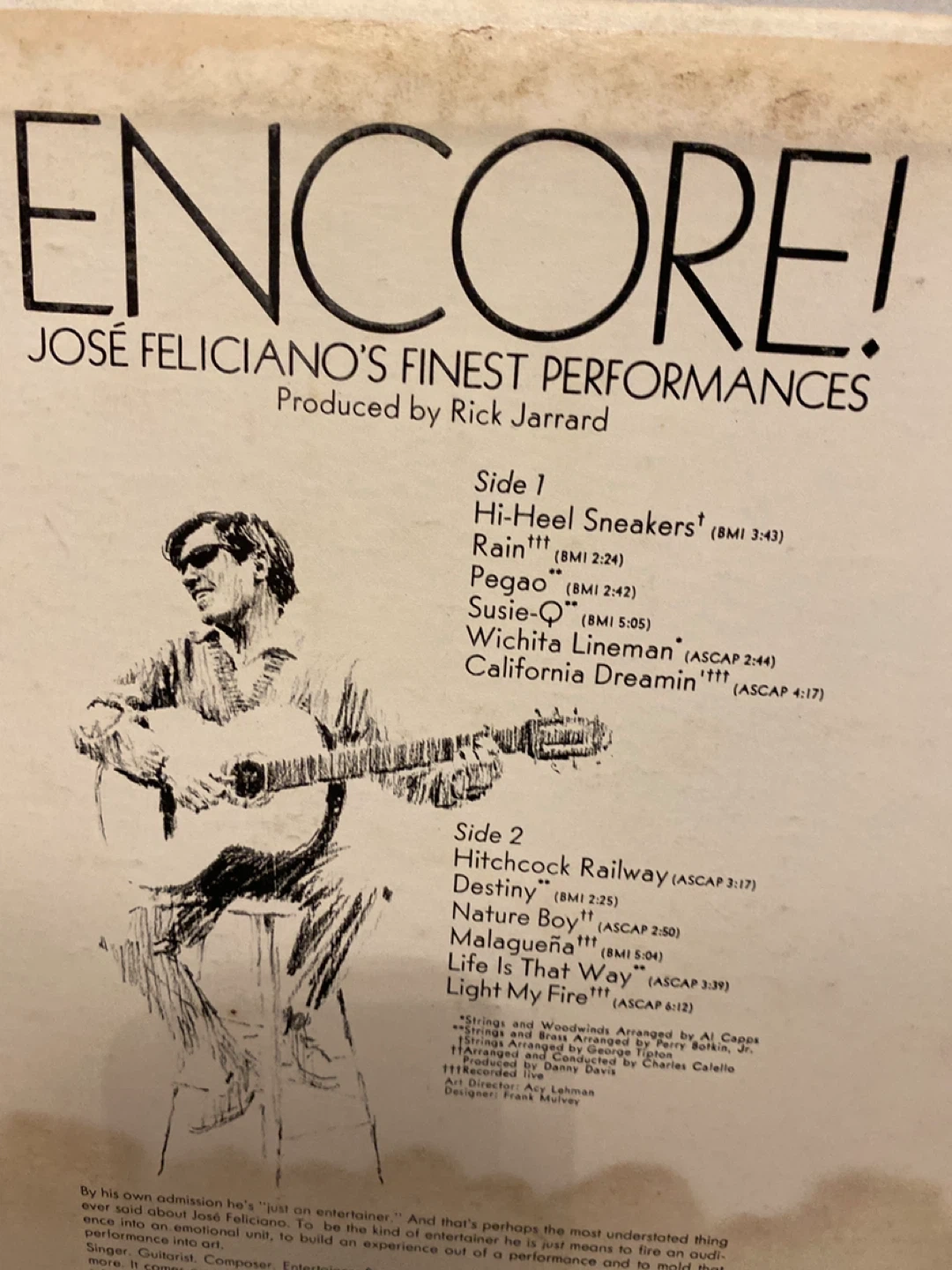 Here are two Jose Feliciano vinyl records. One is a self-titled album while the second is titled "Encore! Jose Feliciano's Finest Performances". Both are in good condition!