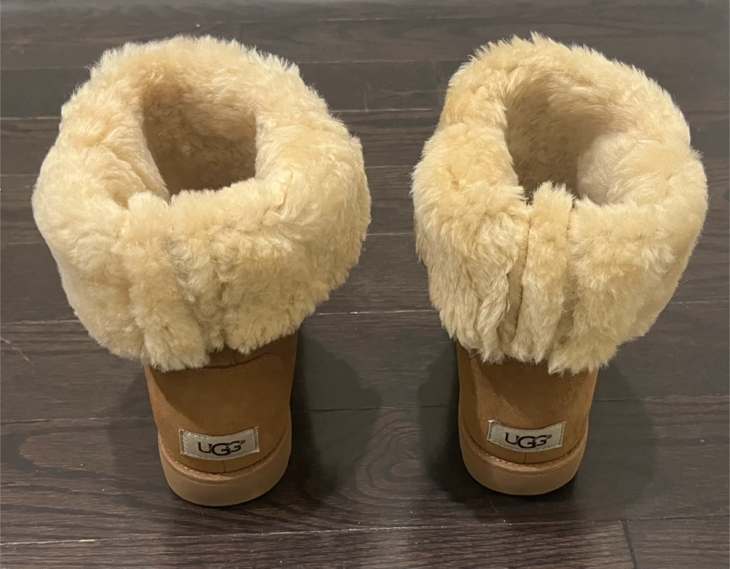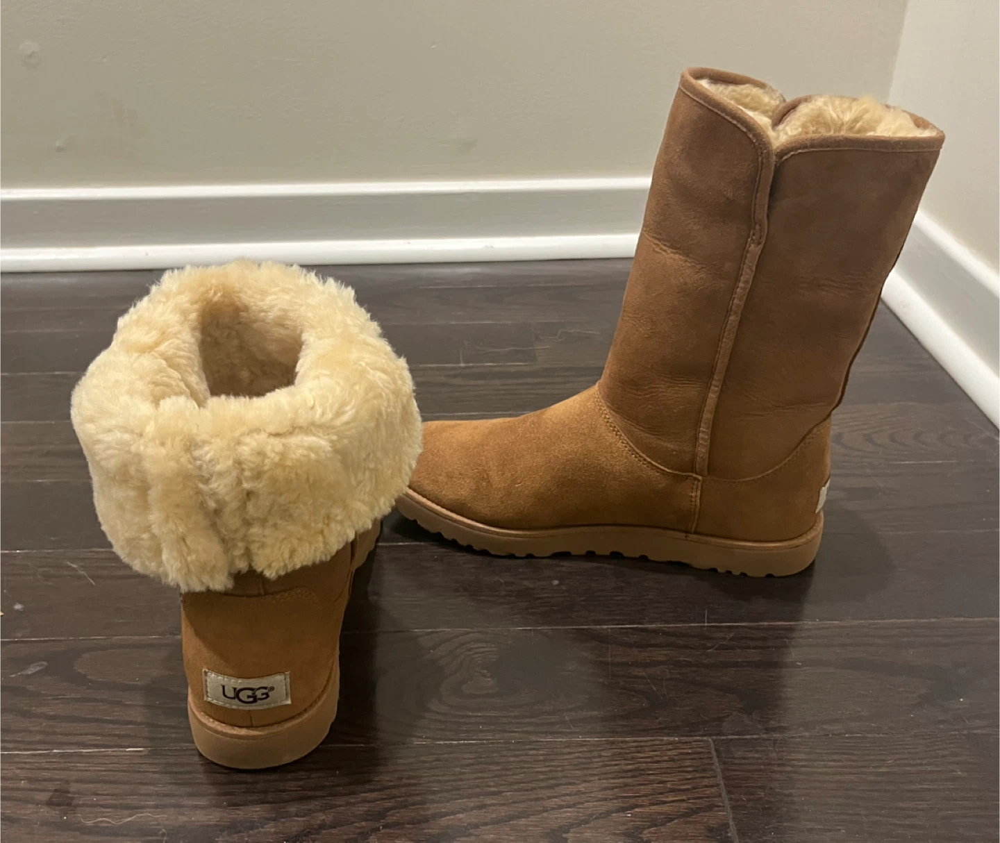 Selling a pair of UGG Classic Short boots in brown. They're in good condition and ready for a new owner! The UGG logo is visible on the heel. These boots also fold down to create another stylish look to match different outfits.