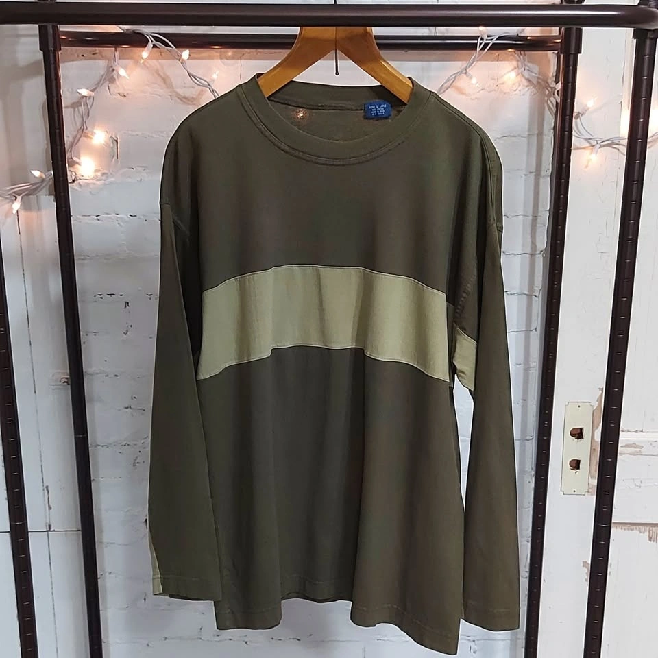 Olive green color, with sage green stripe accents across the front and on the sleeves.