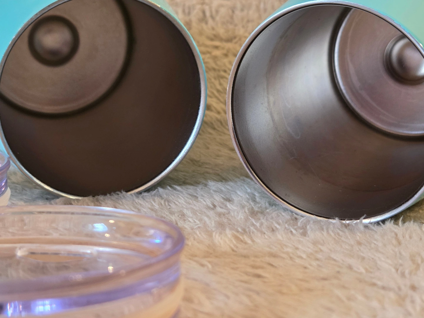 Condition: used and fully functional. Cosmetic paint chips present, including a larger chip near the rim on one cup after a dishwasher cycle. Interiors are stainless and clean. Lids included. Lids are press-on and not fully leak-proof.