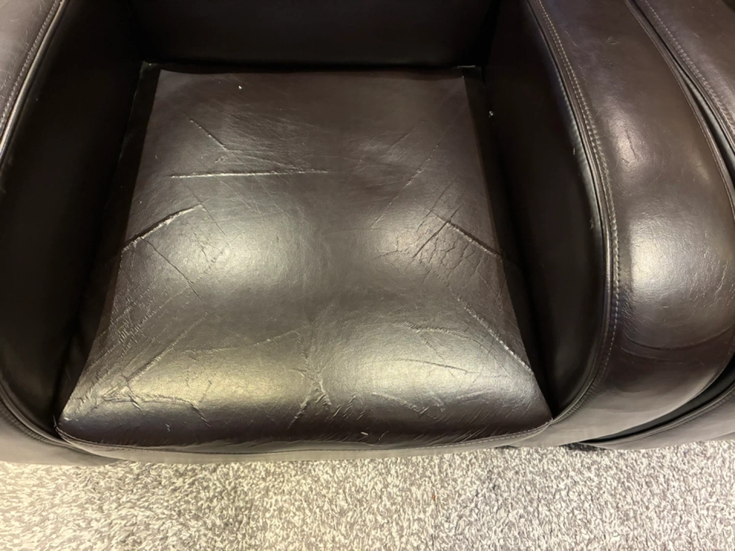 Selling a well-loved brown leather sofa set. There are some signs of wear, like scratches and cracking, but it's still comfy and has lots of life left!