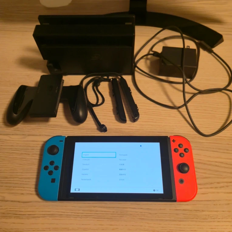 Console is adult owned/played. Not used much. V2 with the better battery life. Comes with all original Nintendo accessories. Dock, charger, joycon grip, joycons, straps. Everything is clean and sanitized.