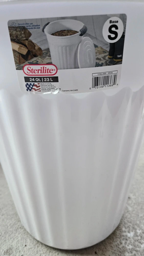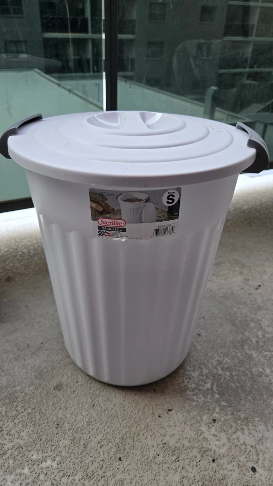 Selling a Sterilite wastebasket! It's white and has a capacity of 24 quarts or 23 litres. The size is small, perfect for a bathroom or small office space.