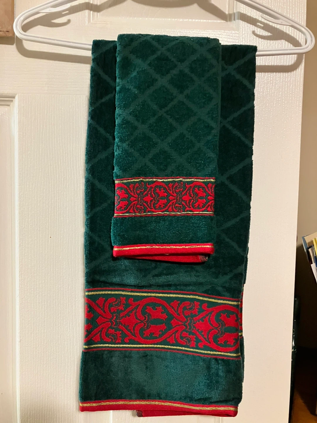 Selling a set of green bath and hand towels. The towels have a diamond pattern and a decorative red and gold border. They're in great condition and would add a festive touch to any bathroom