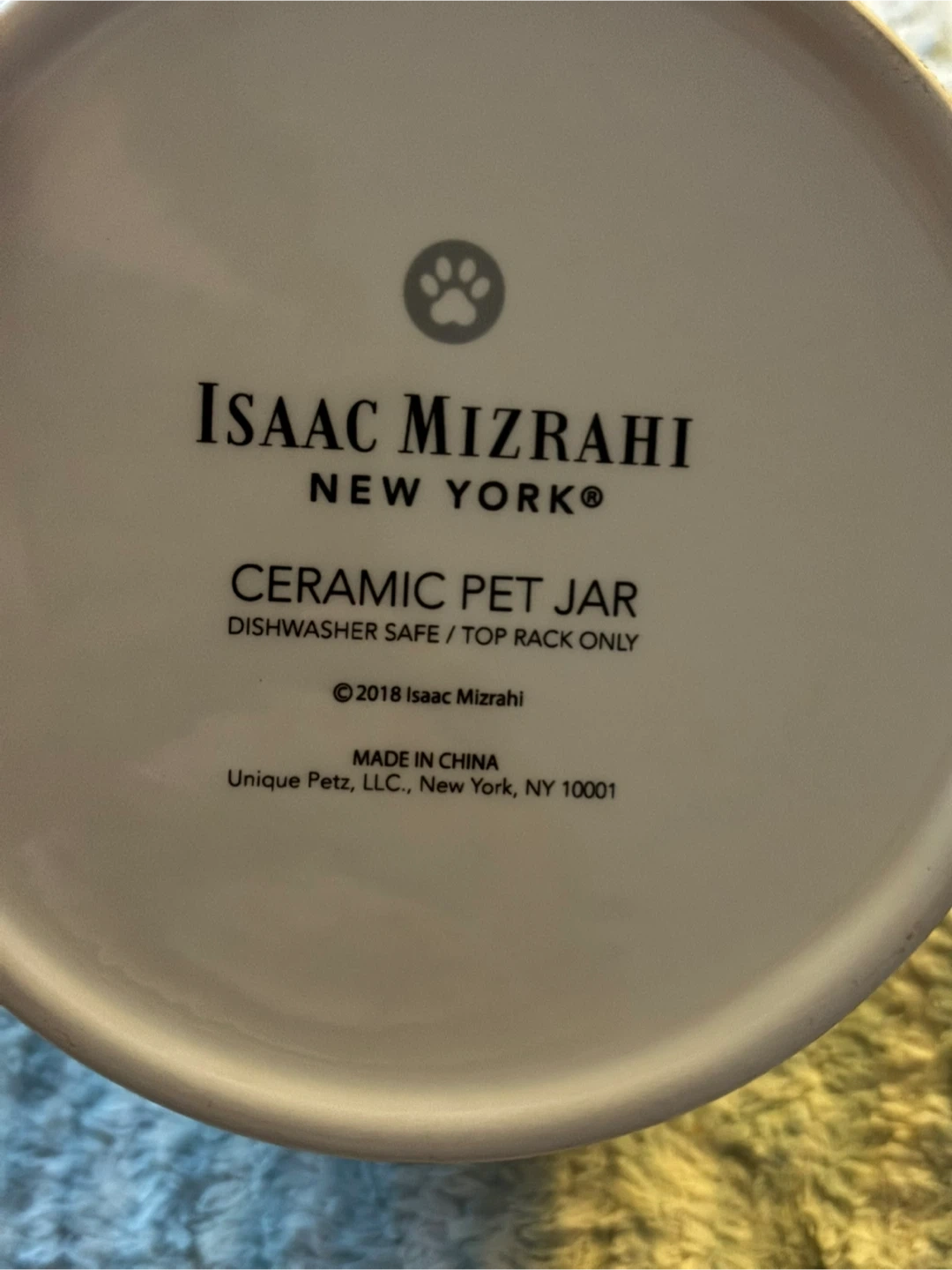 Here's an Isaac Mizrahi New York ceramic pet jar! It's dishwasher safe (top rack only). The jar has a bone-shaped handle on the lid and a floral design on the body of the jar
