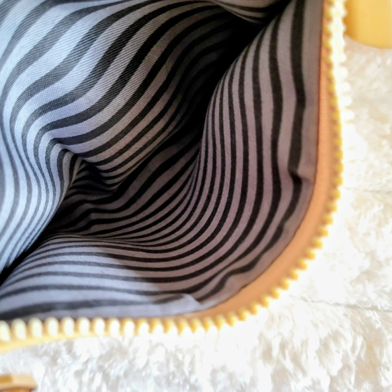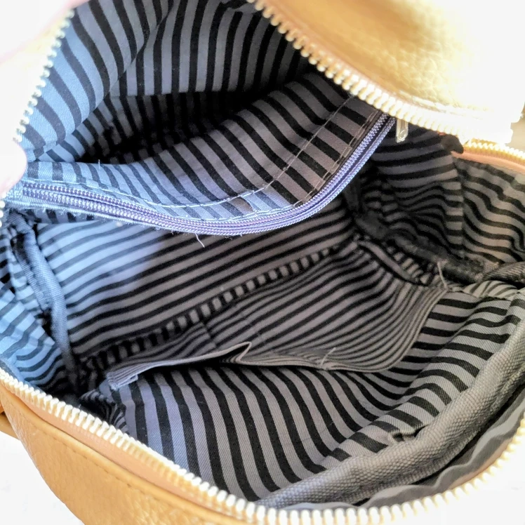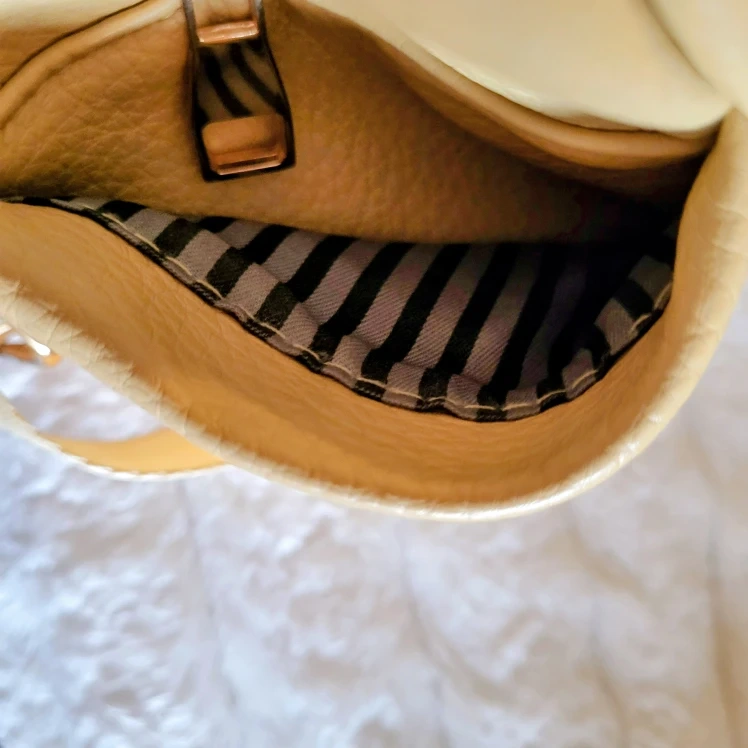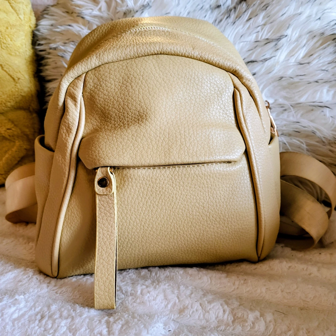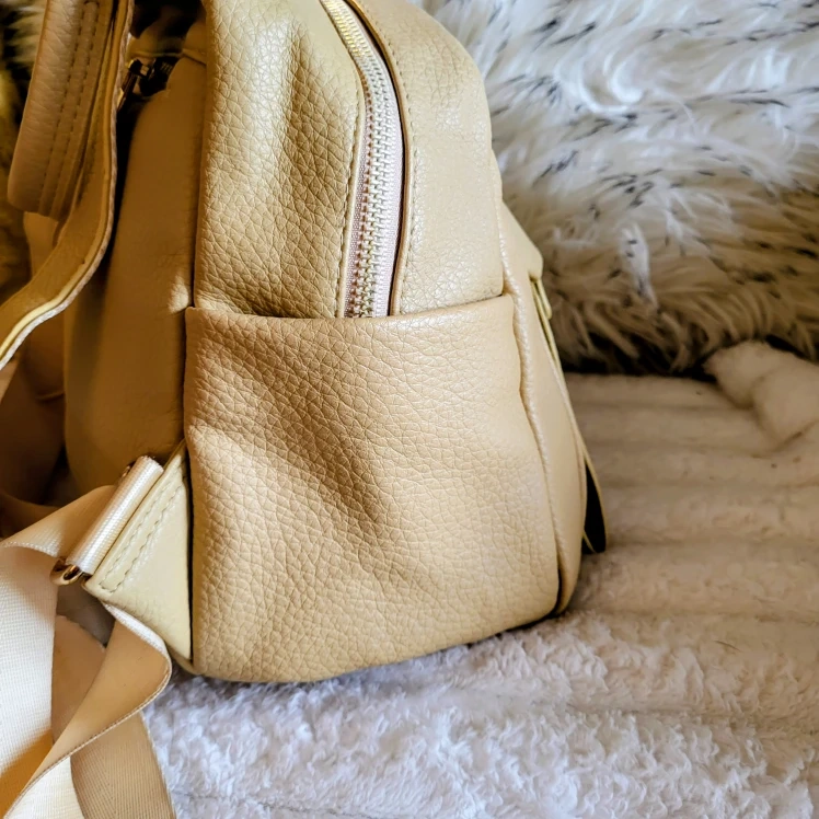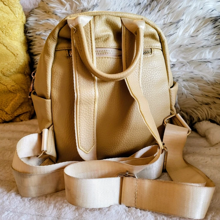 Adorable, butter soft and roomy backpack purse. Great size, no marks smoke free home. Soft pale color, comfortable straps that can be adjusted.