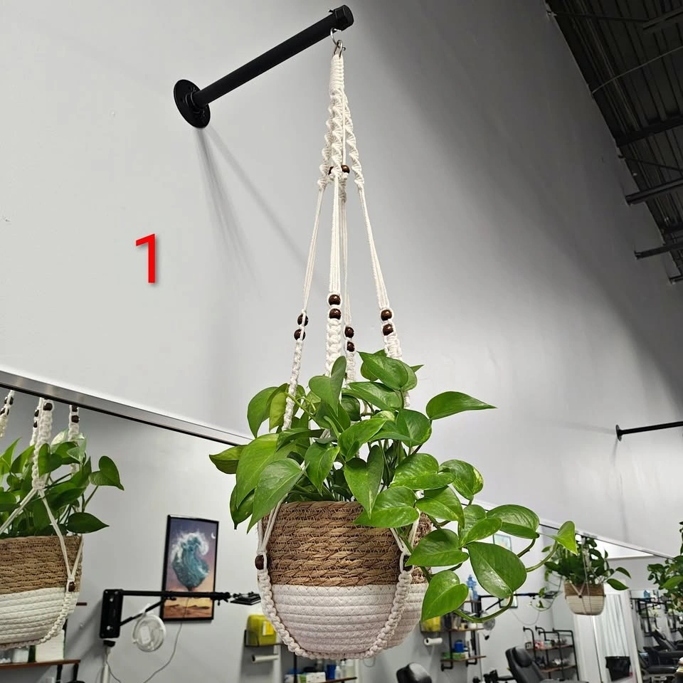 Selling 4 healthy Pothos plants, each in its own macramé hanger and 6" wicker pot. These are well-established, full and vibrant — perfect for adding greenery to any space.