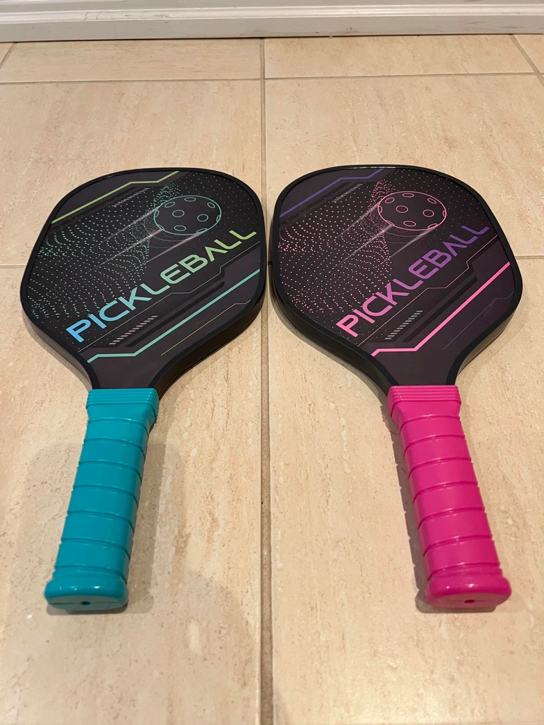 Get ready to play some pickleball with this set! It includes two paddles, four balls, and a handy carrying bag. One paddle has a cool blue handle, and the other has a vibrant pink handle. Perfect for a fun game with friends or family!