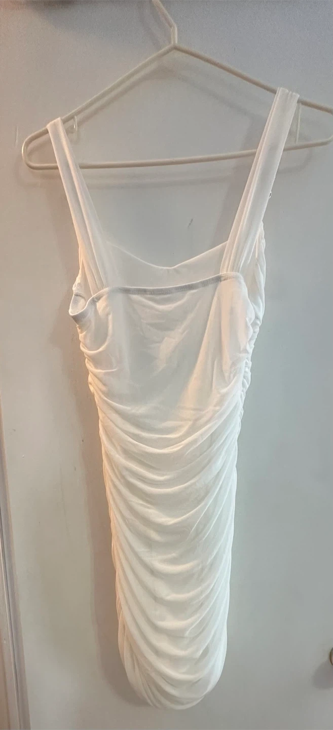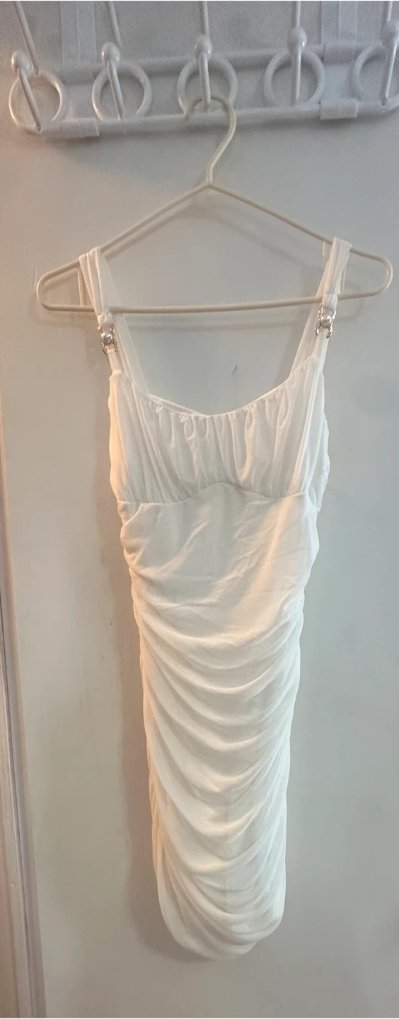 Selling a cute white mini dress! It features a ruched design that's super flattering. Perfect for a night out or a special occasion. It's in great condition and ready for a new home!