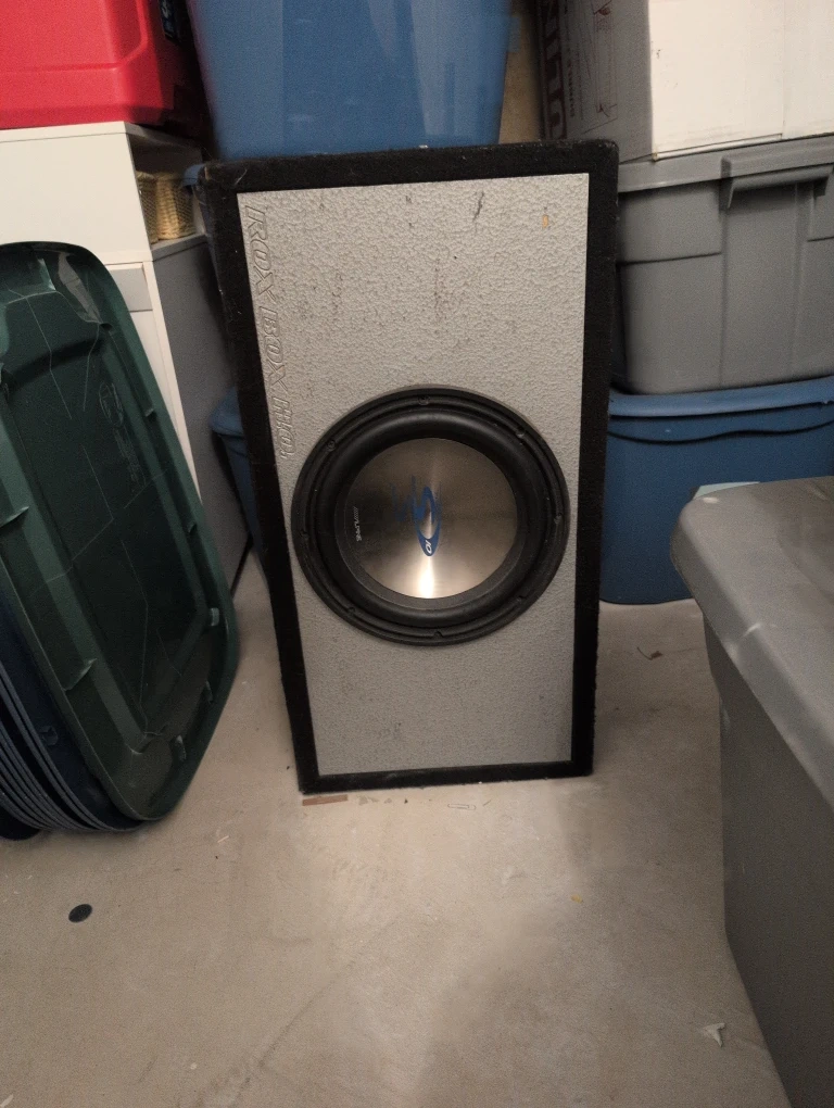Selling an Alpine subwoofer mounted in a Rox Box enclosure. Great for adding some extra bass to your car's sound system!