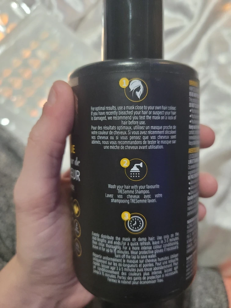 Selling a TRESemmé Colour Enhancing Mask for dark brunette hair. It's a masque rehausseur de couleur with semi-permanent colour pigments and argan oil. This mask helps with colour retention and nourishment for vibrant hair full of shine between colourings. The bottle contains 200 ml (6.76 fl oz). It smells so good