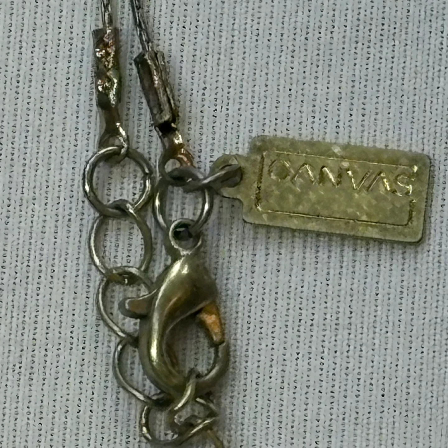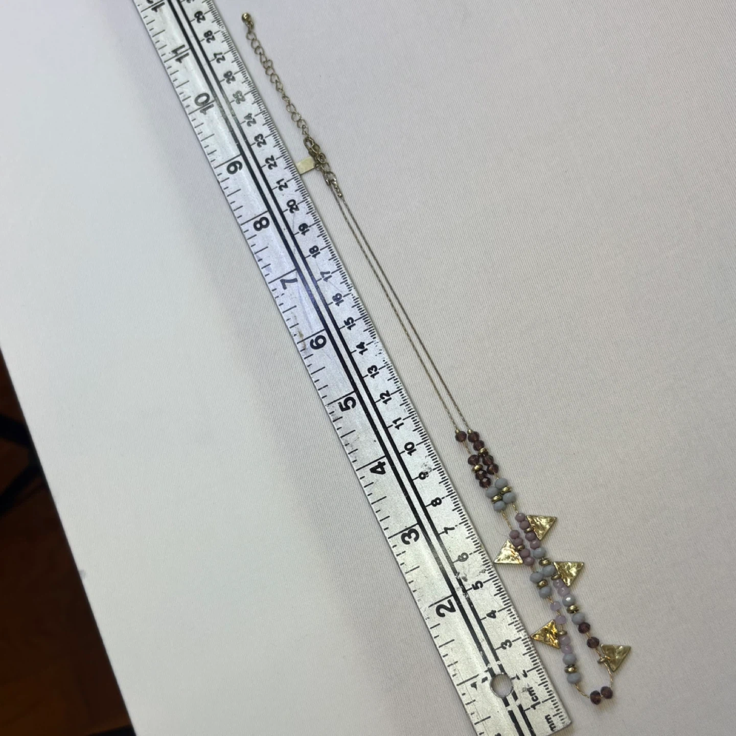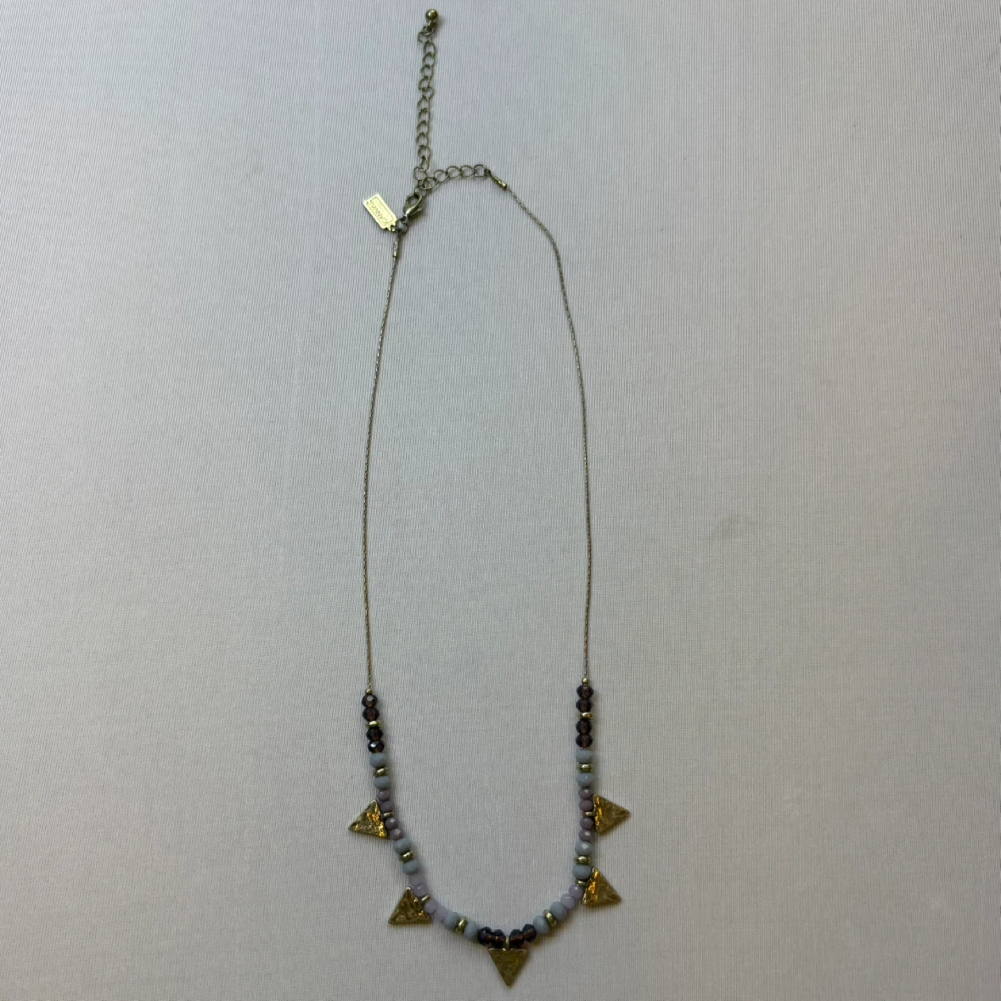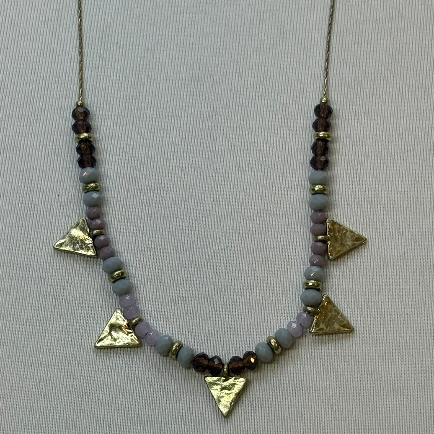 This beautiful Canvas necklace features a string of multi-colored faceted and smooth beads in shades of lilac, lavender, and grey, accented by hammered gold-tone triangle charms. The necklace has an adjustable thin gold-tone chain and a lobster clasp closure. This statement piece is perfect for adding a touch of bohemian or minimalist geometric style to any outfit.