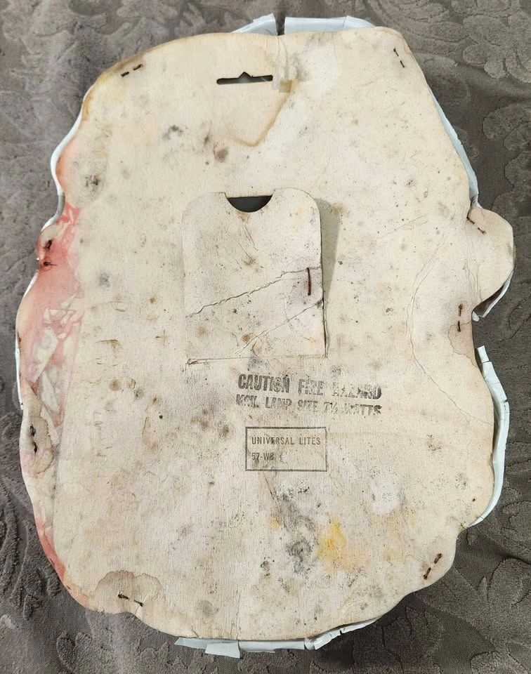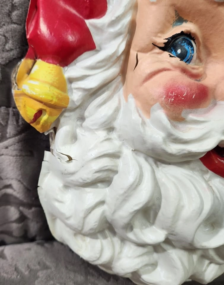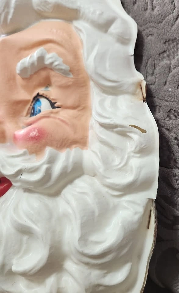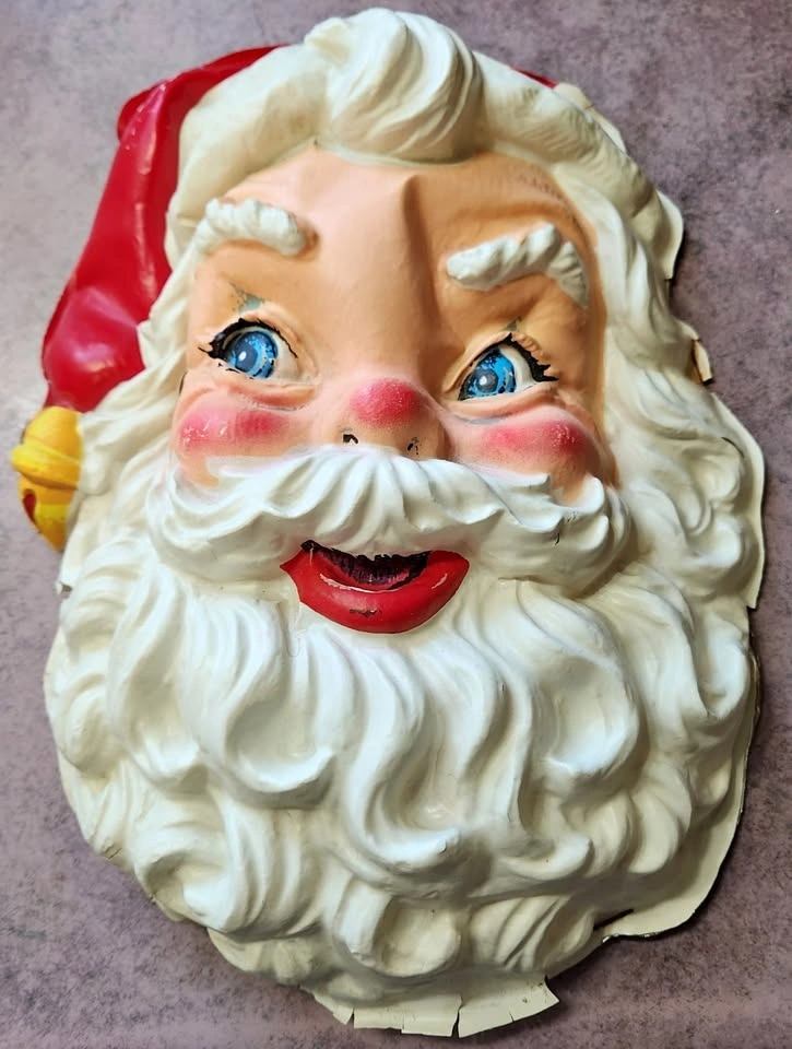 Absolutely gorgeous vintage Santa face, made by Universal Lites in the late 1950s. It was originally intended as a light-up face, however this item does not have the light bulb and cord. It is a vacuum-formed (blow-mold style) thin plastic face with hand painted details. Please note there is some cracking in various spots which I have tried to show in the pictures. The face measures 12 inches tall and 9 inches wide. An absolutely superb addition to any vintage or mid-century modern Christmas collection. Sold as is.