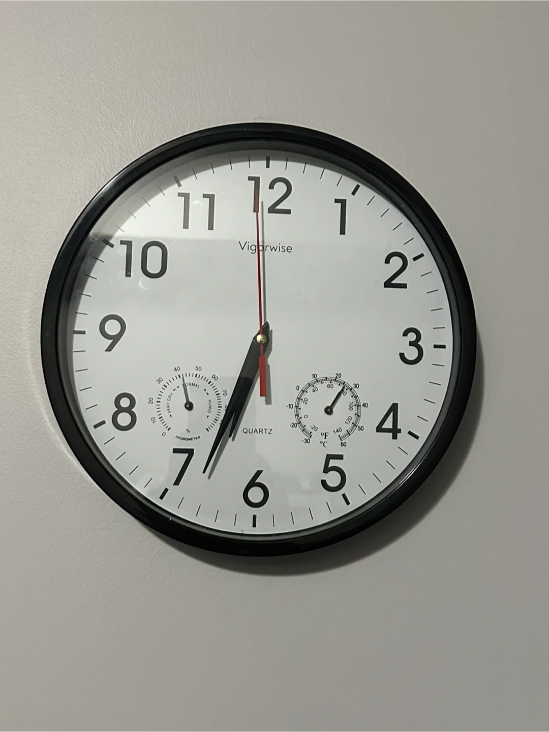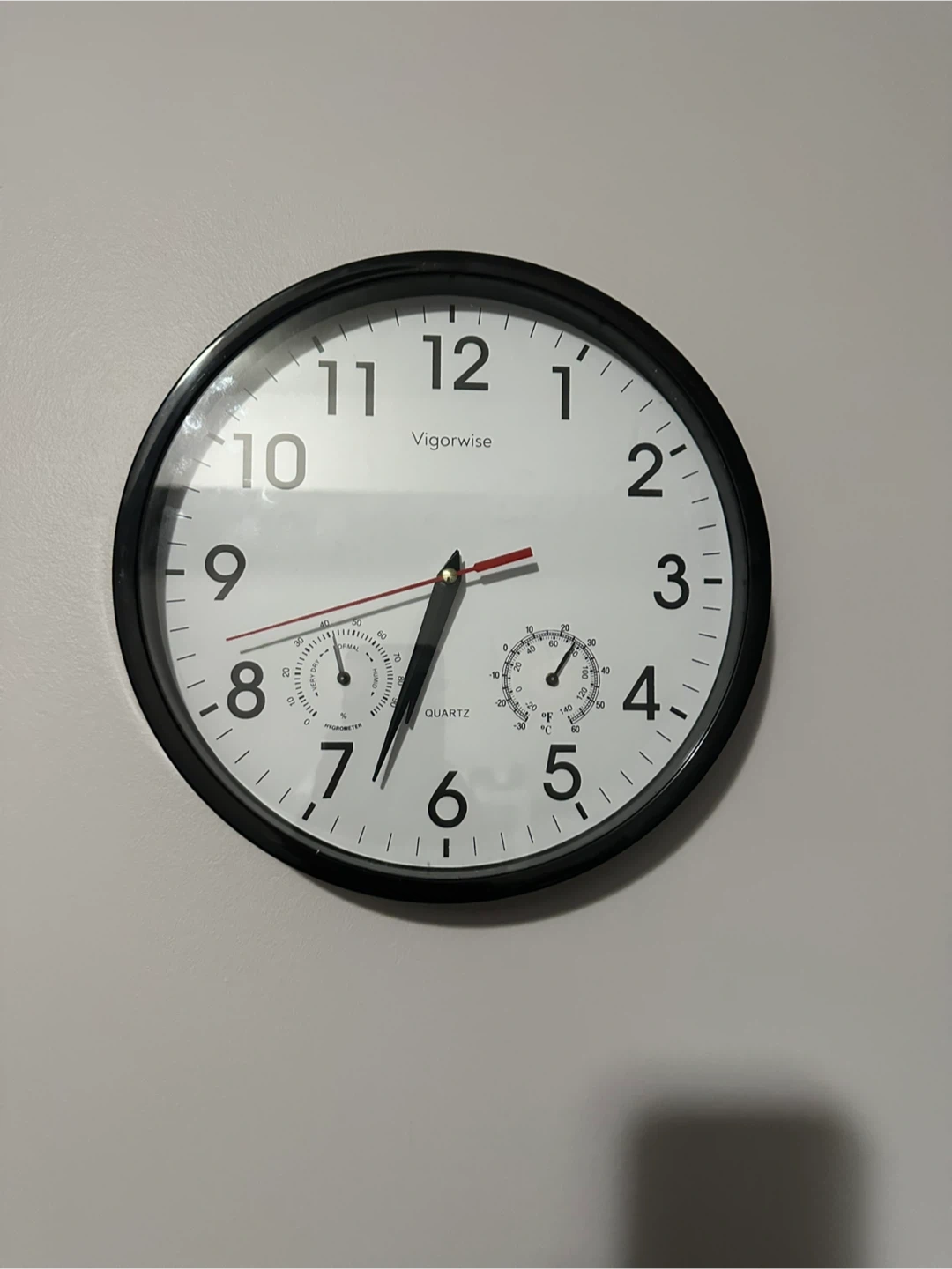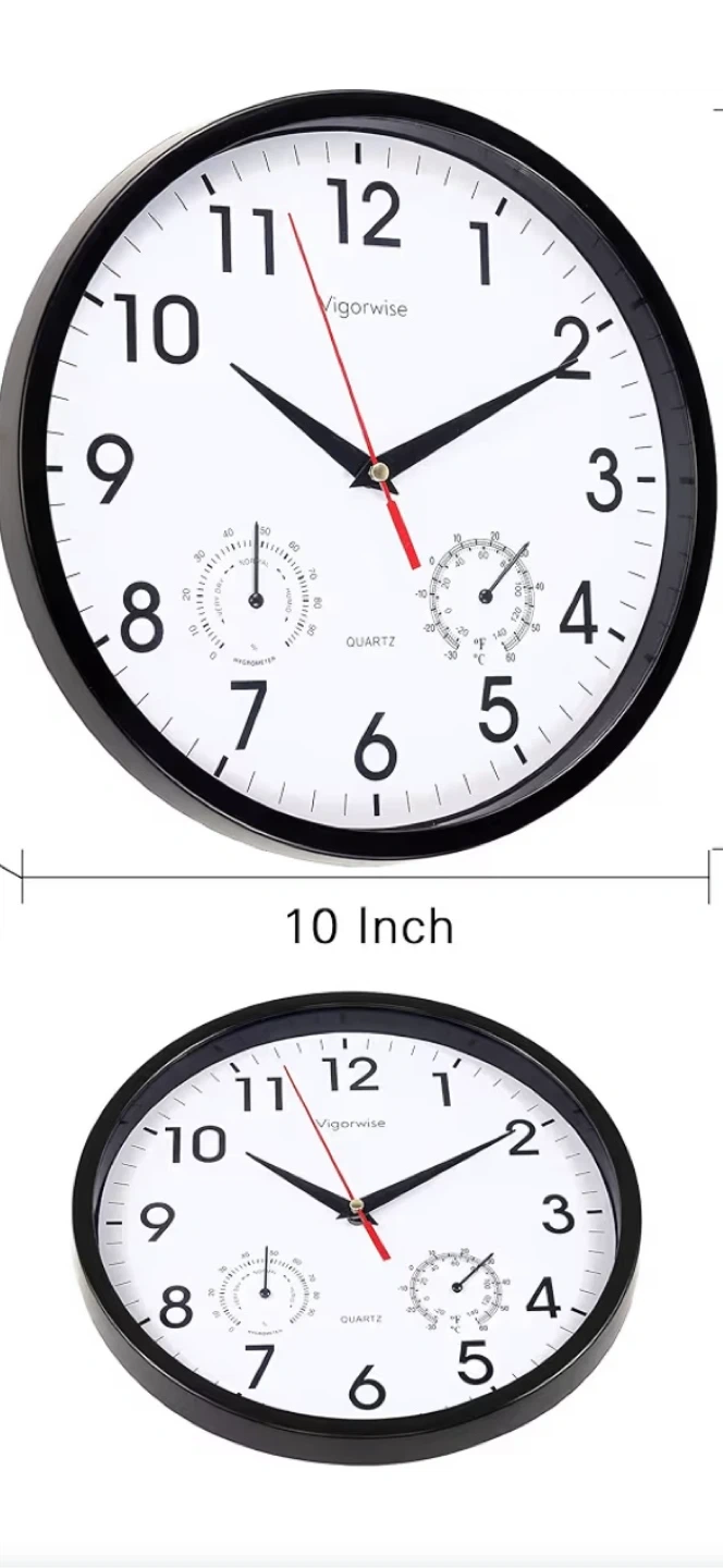 Selling a Vigorwise wall clock! It's a 10-inch clock with a black frame and a white face. It also displays temperature and humidity