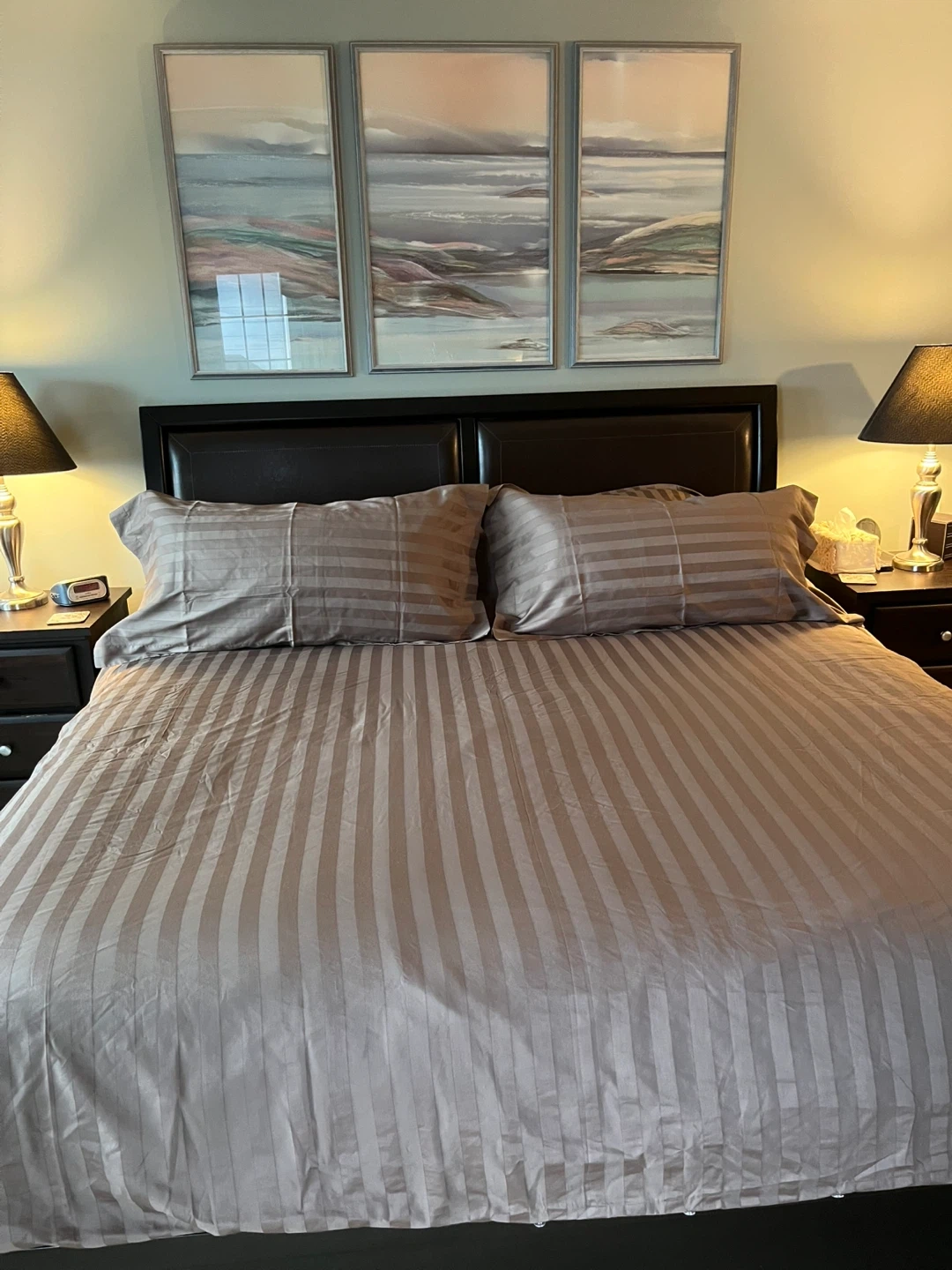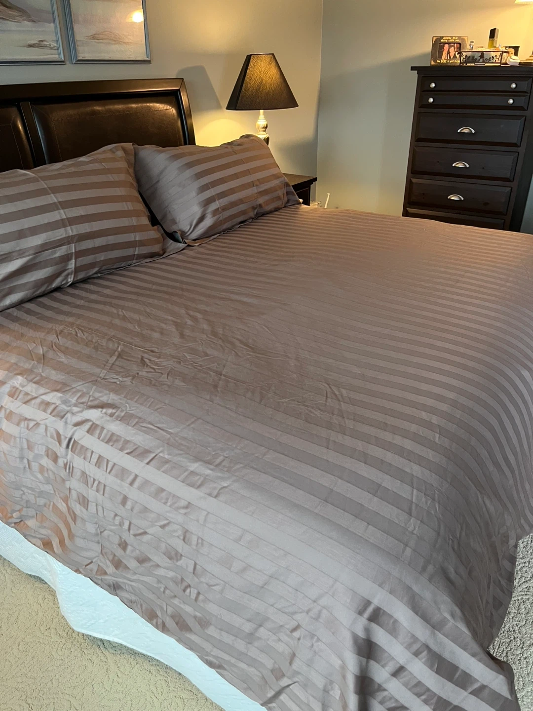 King Size Duvetcover in a Brown Demask Stripe. Made of 64% cotton and 36% polyester. A neutral colour that fits in any bedroom! Brand is by Hometrends. Comes with a buttoned closure and two king size pillow shams.