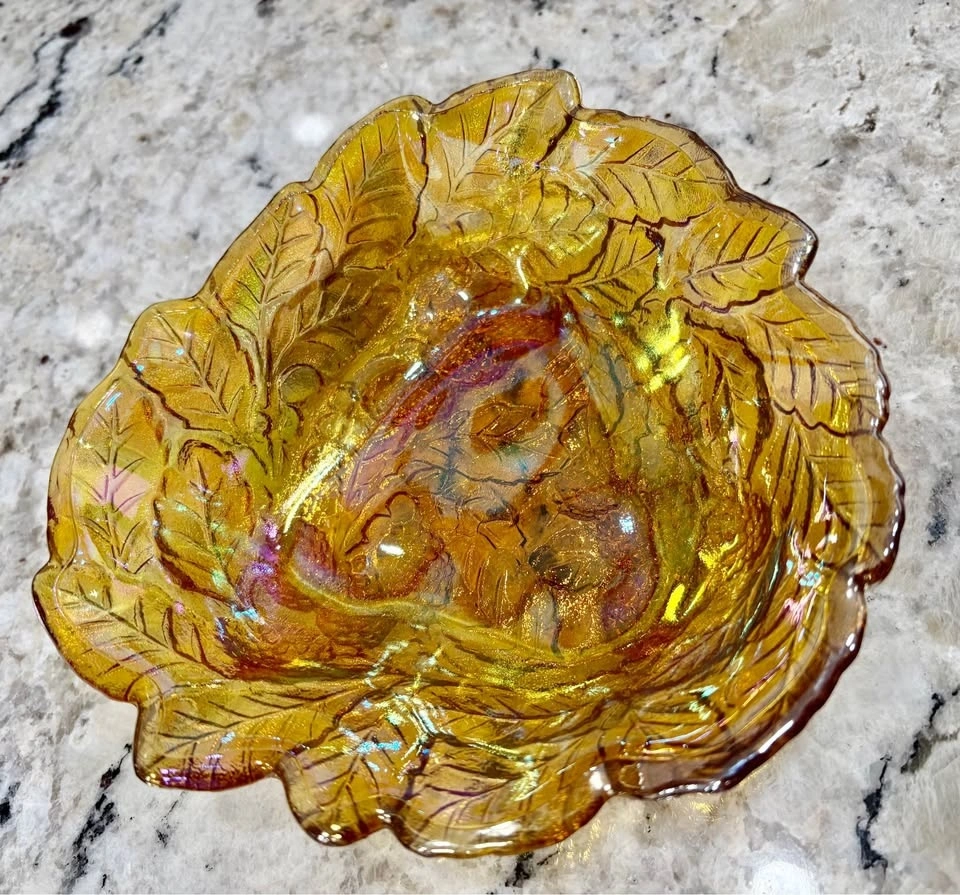Beautiful amber glass bowl with a leaf design. It's in great shape and has a nice shine to it. Pictures don’t do it justice. Dimensions are shown in pictures.