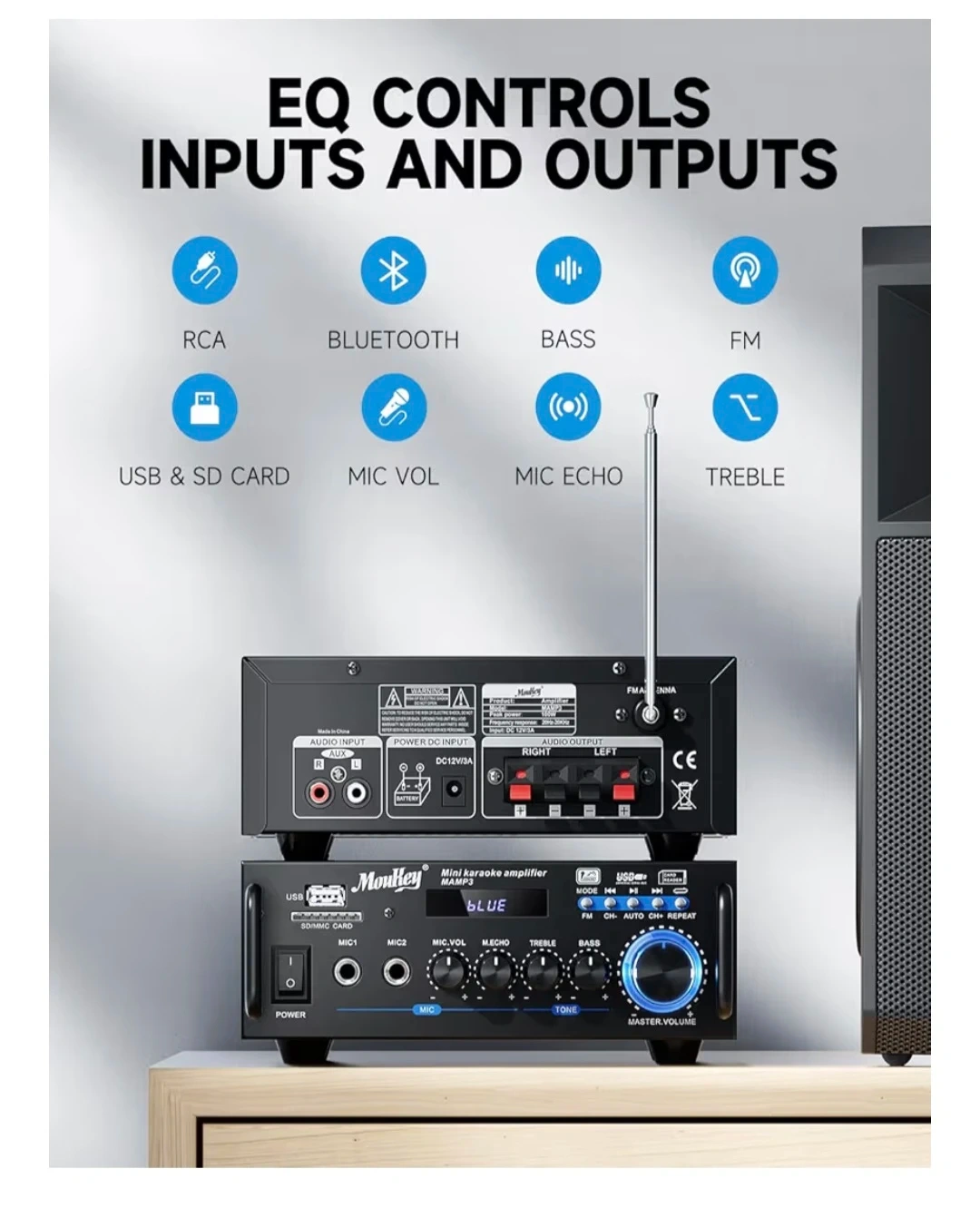 Selling a Moukey MAMP3 Mini Karaoke Amplifier! It's a Bluetooth 5.0 stereo amplifier with 2.0 channels, (Total Watts is 400)
