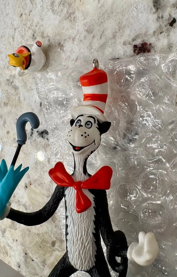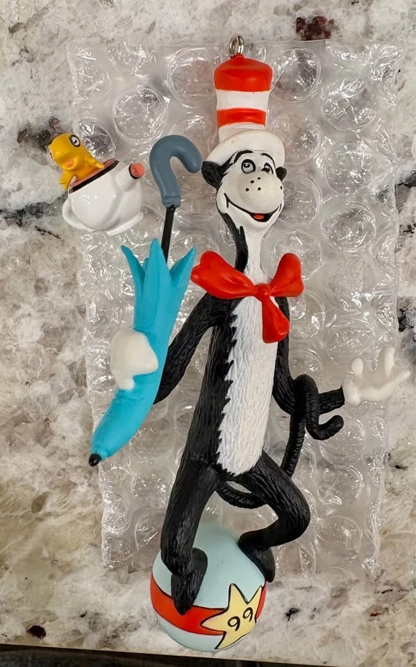 1999 Hallmark Keepsake Ornaments (pair). The Cat in the Hat figurine with umbrella and Goldfish in a bowl. Still in original packaging, box is a little worn. Great Christmas decoration!