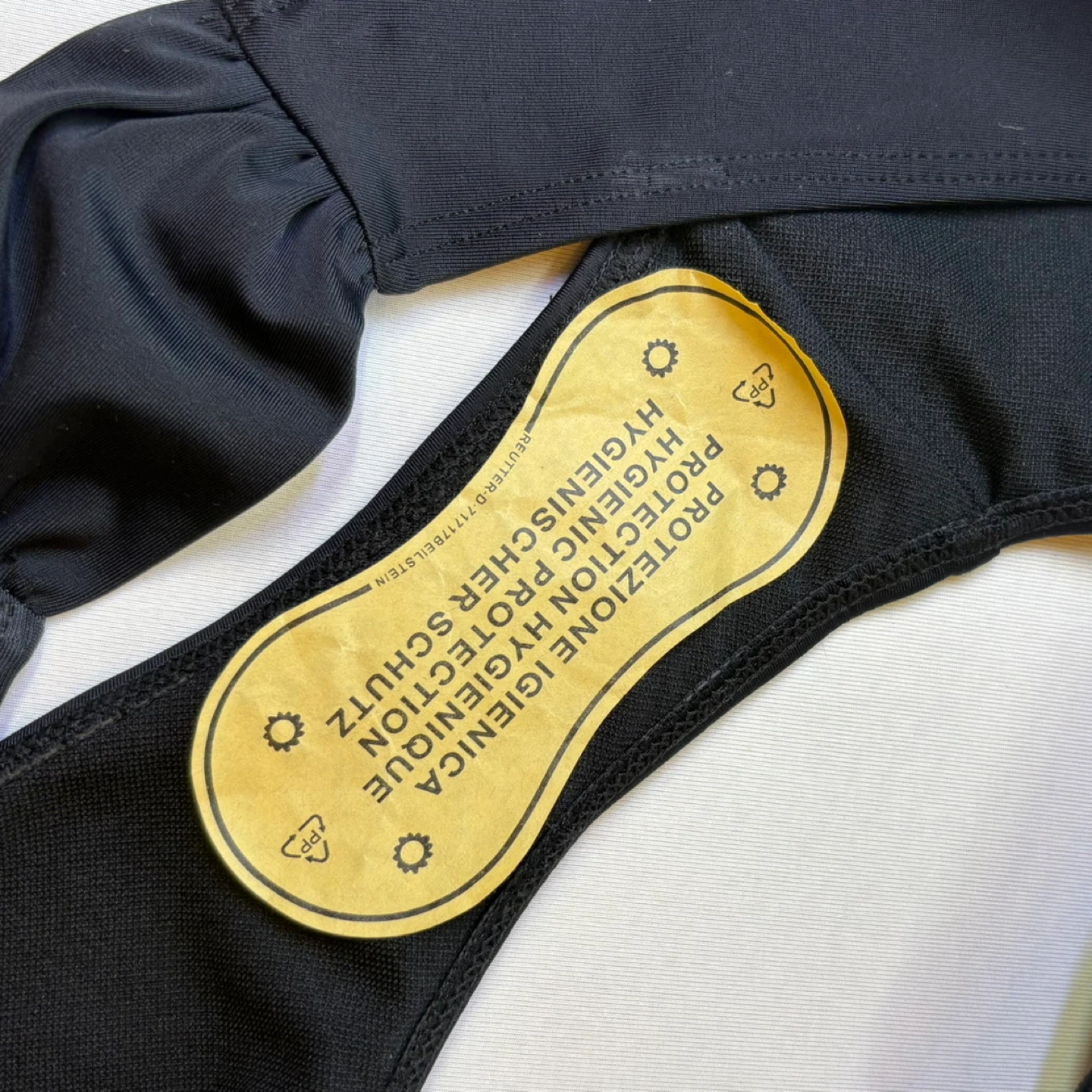 These Shekini black bikini swimsuit bottoms feature a stylish ruched side design and come in size M, made from 80% polyamide and 20% elastane. These bottoms are new with the hygienic liner still attached. Perfect for your next beach getaway!