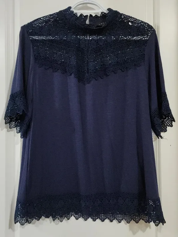 Here's a navy blue top with beautiful lace detailing around the collar, sleeves, and hem. It's in great condition and would be a lovely addition to your wardrobe!