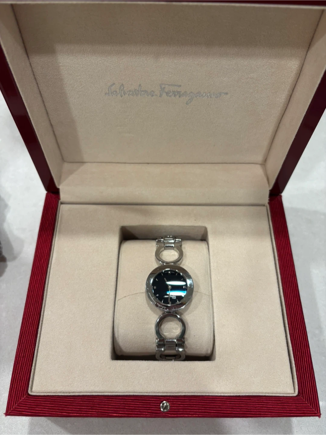 Stunning silver ferragamo watch. The size will fit someone with smaller hands as the chains were adjusted. Does not come with the original box but this is a box of a different ferragamo watch.