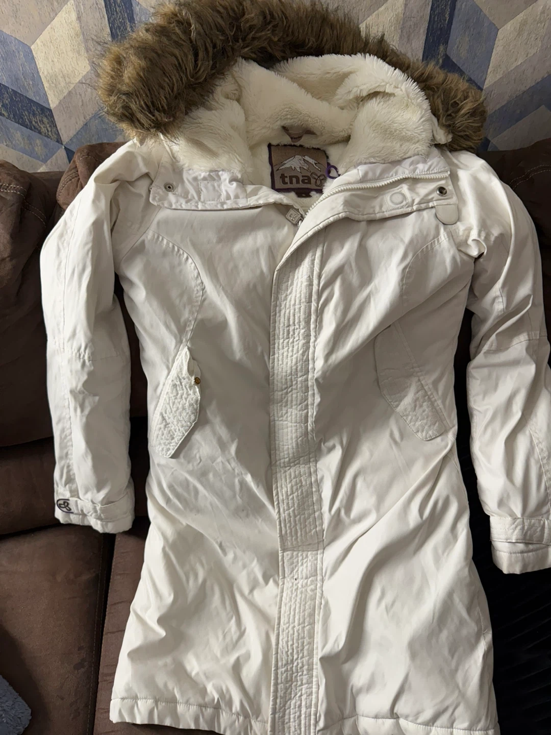 Selling a TNA Glacier winter coat in white. It's a size small and features a cozy faux fur trim on the hood. Perfect for staying warm during the cold Canadian winters!