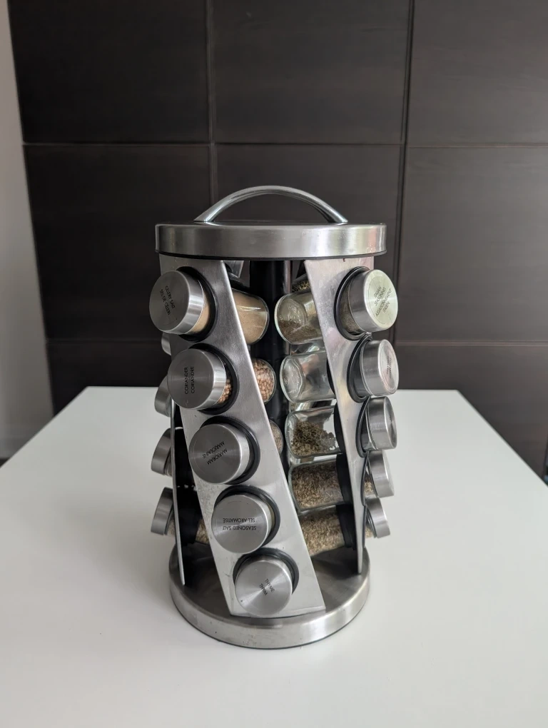 Selling a rotating spice rack. It comes with jars, ready to organize your spices! Great for keeping your kitchen tidy and your spices within easy reach