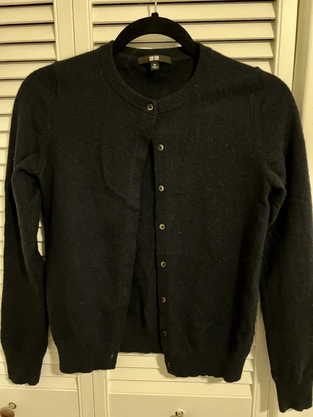 Wrapped yourself in this soft Uniqlo navy blue pure cashmere cardigan in size XS. It's in great condition and ready to keep you cozy!