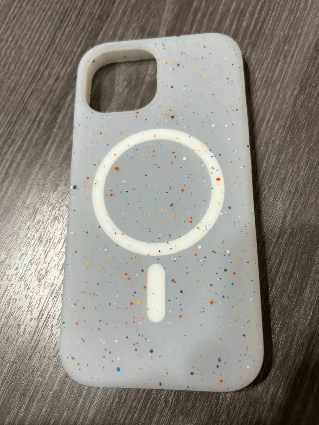 This phone case features a fun speckled design. It's MagSafe compatible for easy charging. The case is made of a durable material. Protect your phone with style!