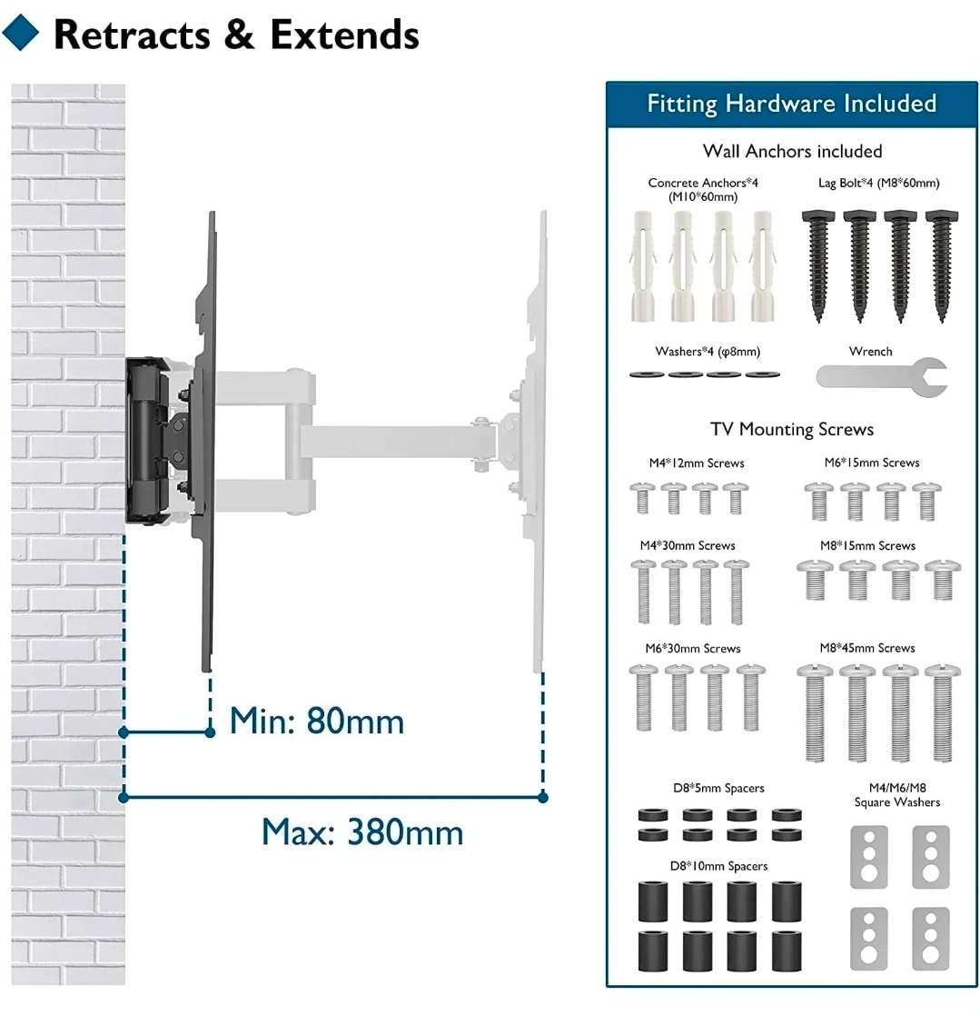 Selling a BONTEC TV wall mount, perfect for TVs ranging from 23 to 70 inches. It can hold up to 99lbs and fits VESA 400x400mm. This full-motion bracket is designed for 32, 40, 50, 55, and 65-inch LED, OLED, LCD flat and curved screens. It features tilt and swivel functions with 6 arms for optimal viewing angles.