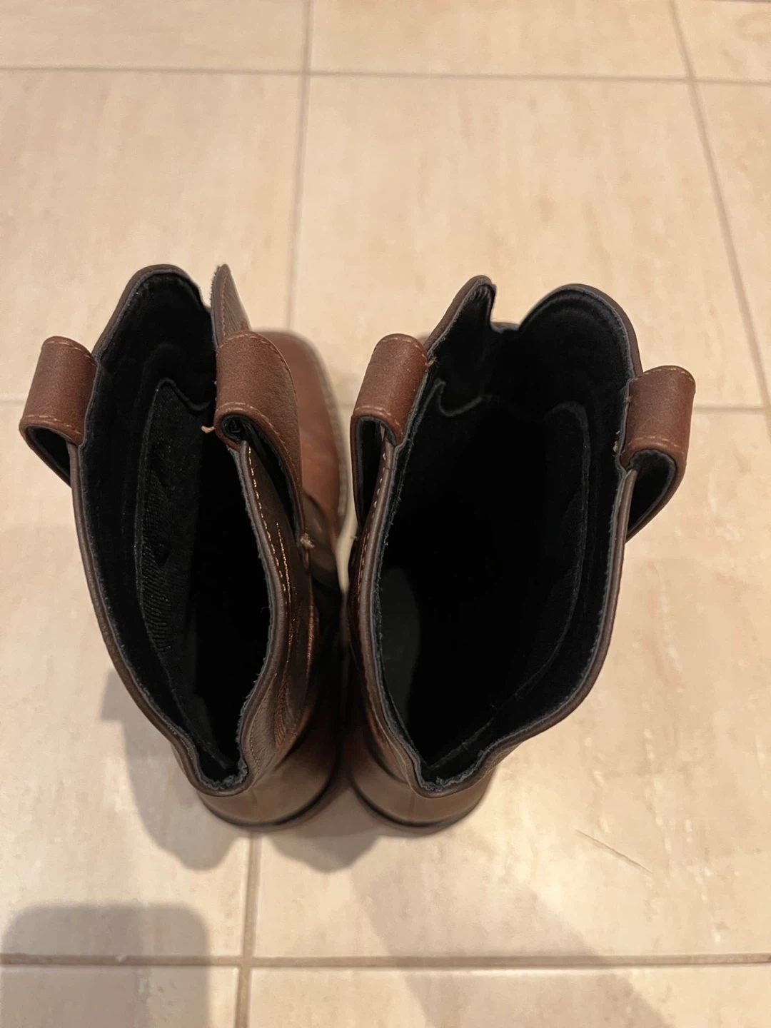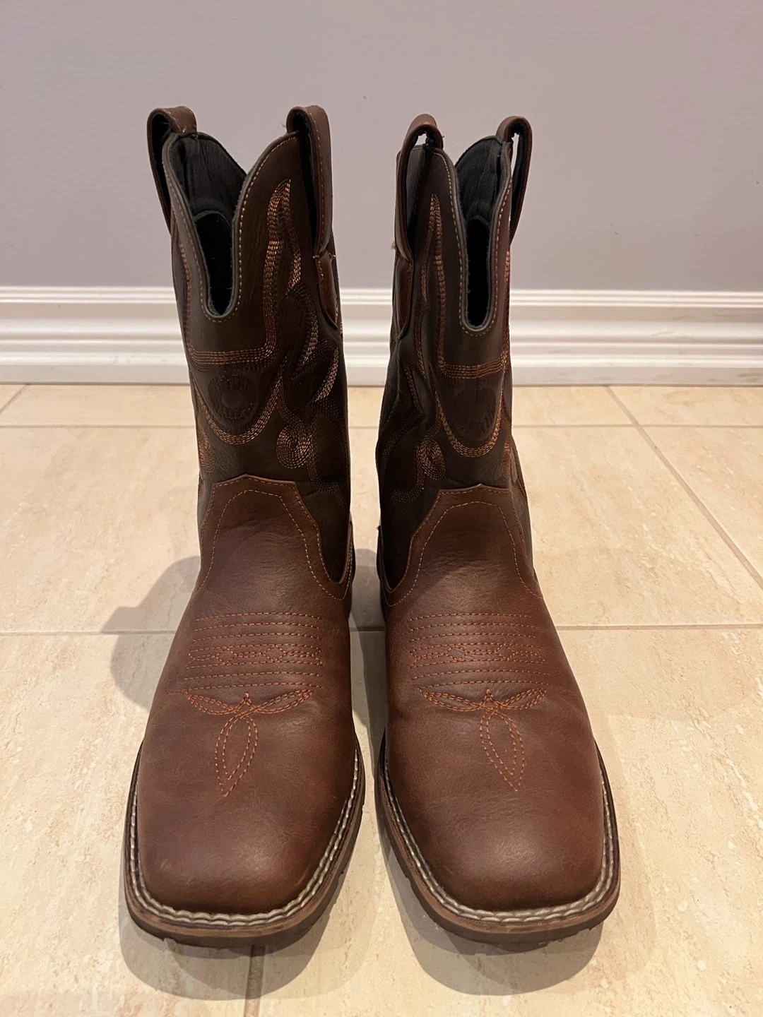 Selling a pair of brown leather cowboy boots. They have a nice design stitched on the upper part of the boot. These are in great condition and ready for a new owner!