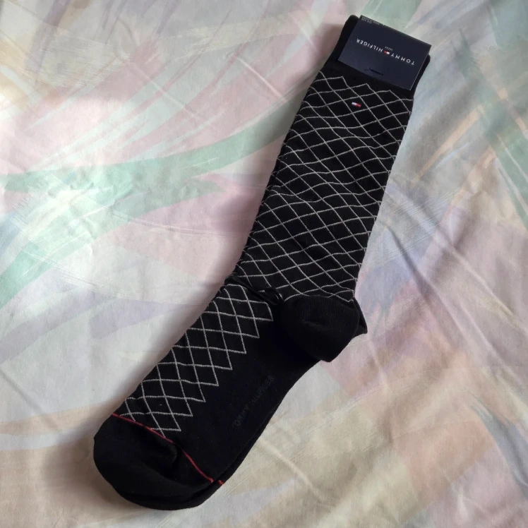 Selling a pair of Tommy Hilfiger socks in black with a white diamond pattern