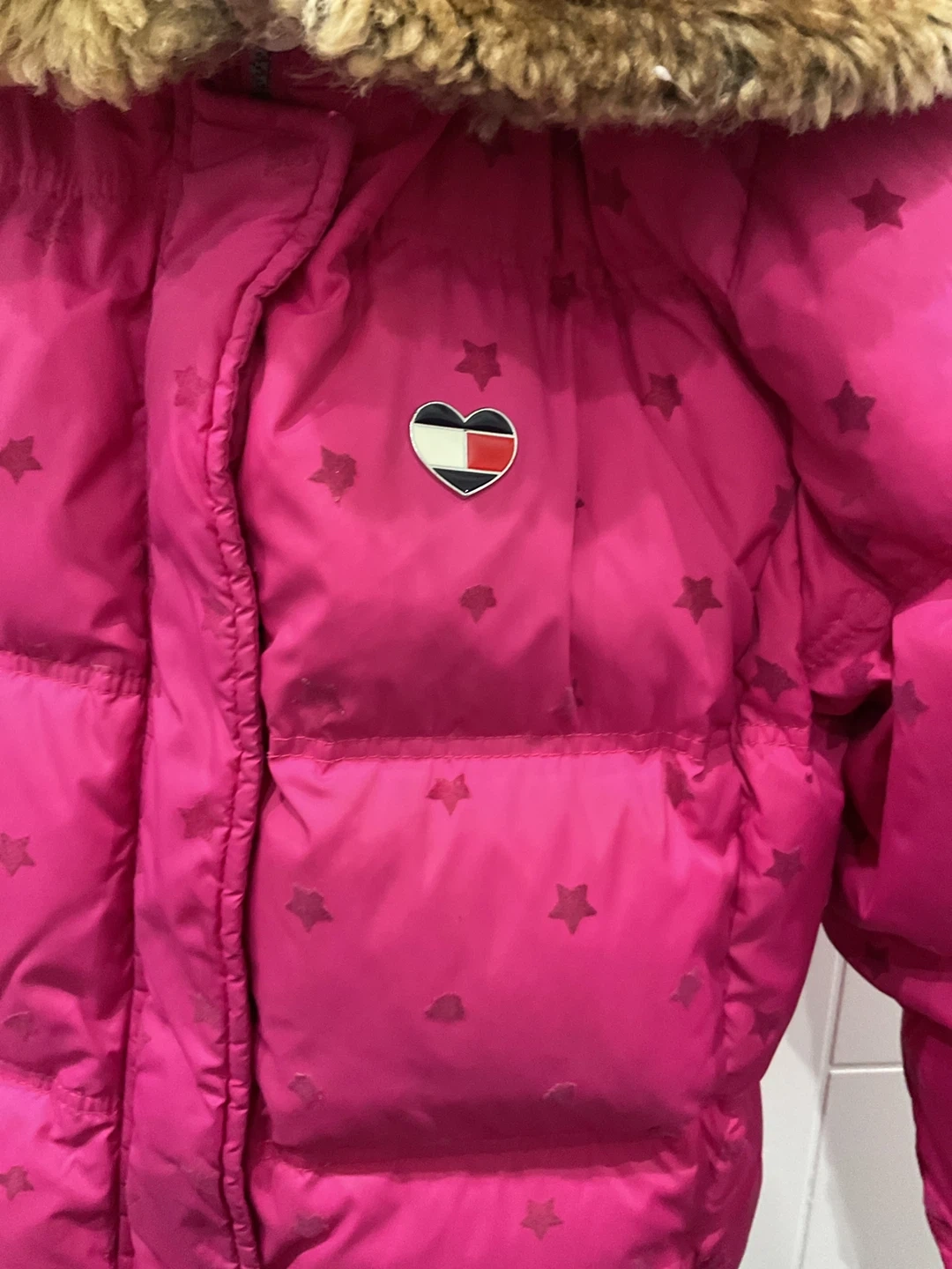 A Tommy Hilfiger pink puffer jacket in size XL (12-14) with star pattern and fur hood. It's in great condition with only a small stain that can be washed out. It’s ready for a new home!
