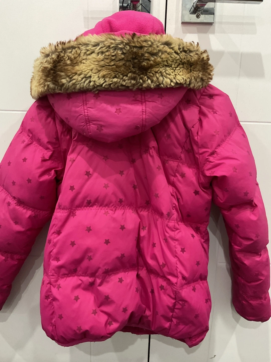 A Tommy Hilfiger pink puffer jacket in size XL (12-14) with star pattern and fur hood. It's in great condition with only a small stain that can be washed out. It’s ready for a new home!