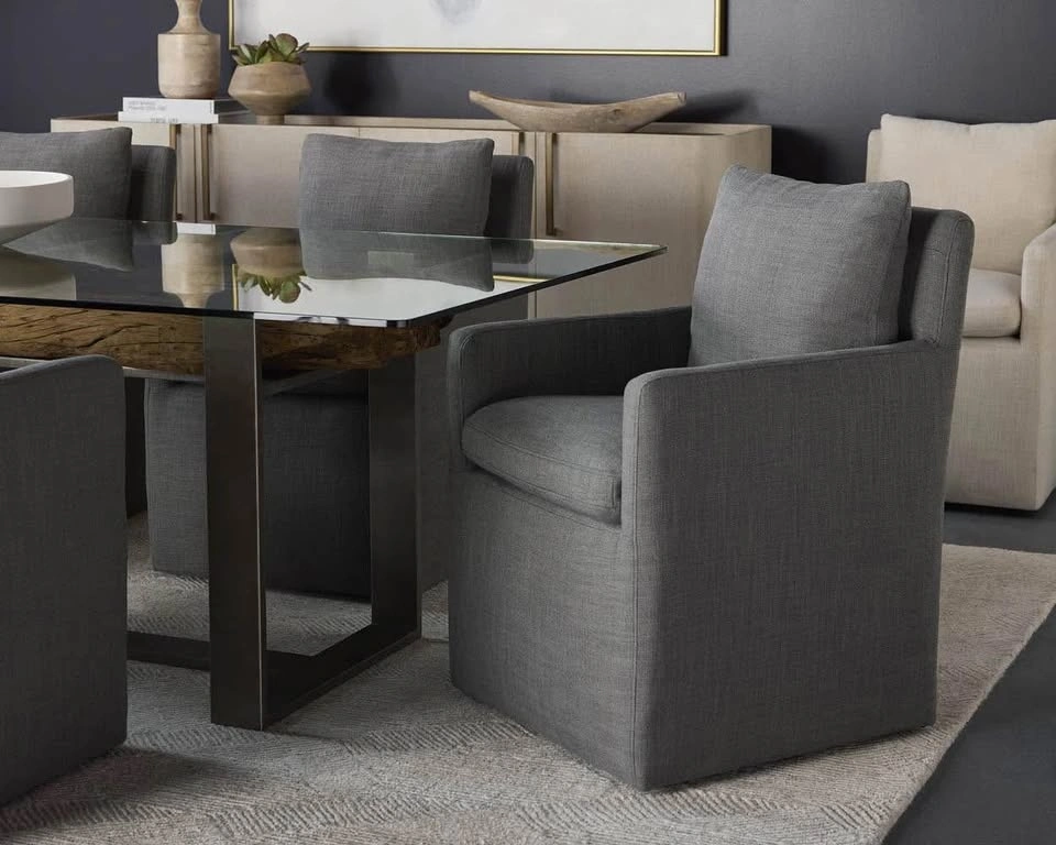 A formal and comfortable wheeled dining armchair that is full of classic appeal. Stocked in Effie Smoke fabric. As this piece features feather-filled cushions, occasional rotation and fluffing is required to maintain its lasting comfort and beauty.