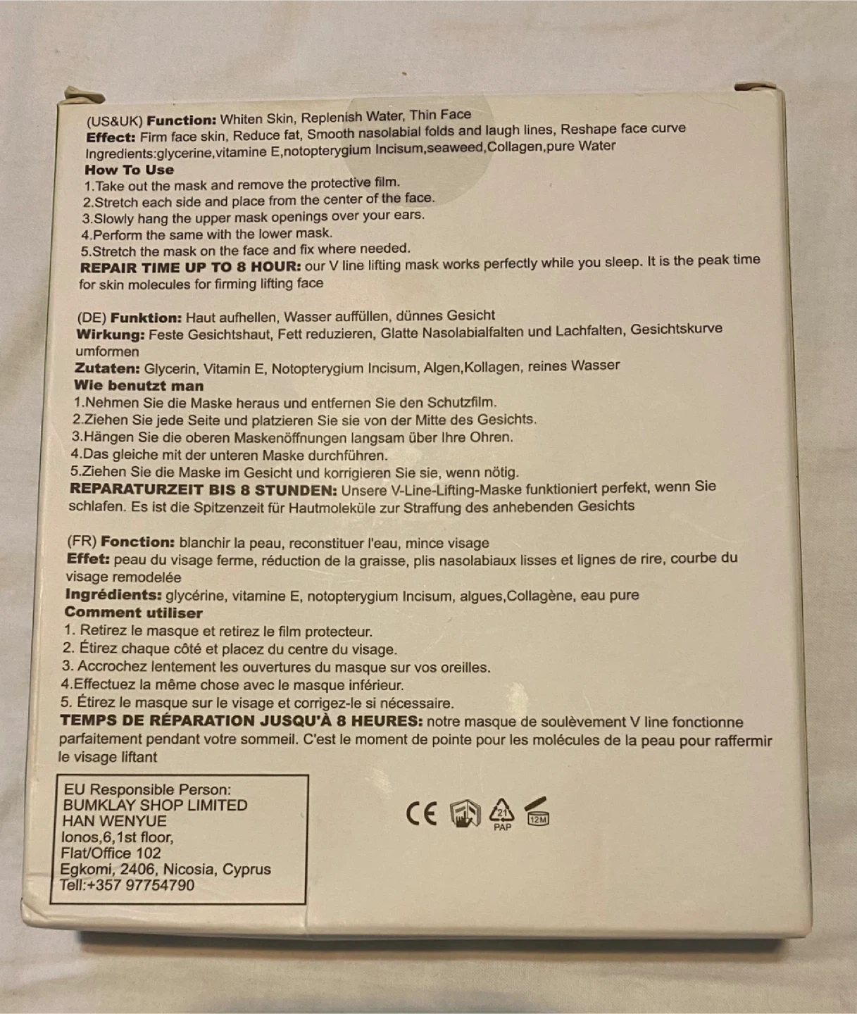 Selling a box of SegMiniSmart V Line Masks. This box is brand new and contains 5 individual masks. These masks are designed for V shape face lifting, double chin reduction, and firming moisturizing. They contain ingredients like glycerine, vitamin E, seaweed, and collagen. Perfect for some skin repair while you sleep!