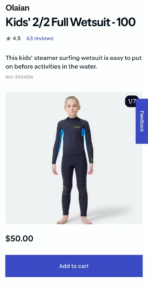 Selling an Olaian kids' 2/2 full wetsuit in size 14. It's designed to be easy to put on before water activities. The tag indicates it fits kids between 153-162 cm (60-64 inches). The wetsuit is 2.2mm thick and suitable for use in water temperatures between 17°C and 22°C