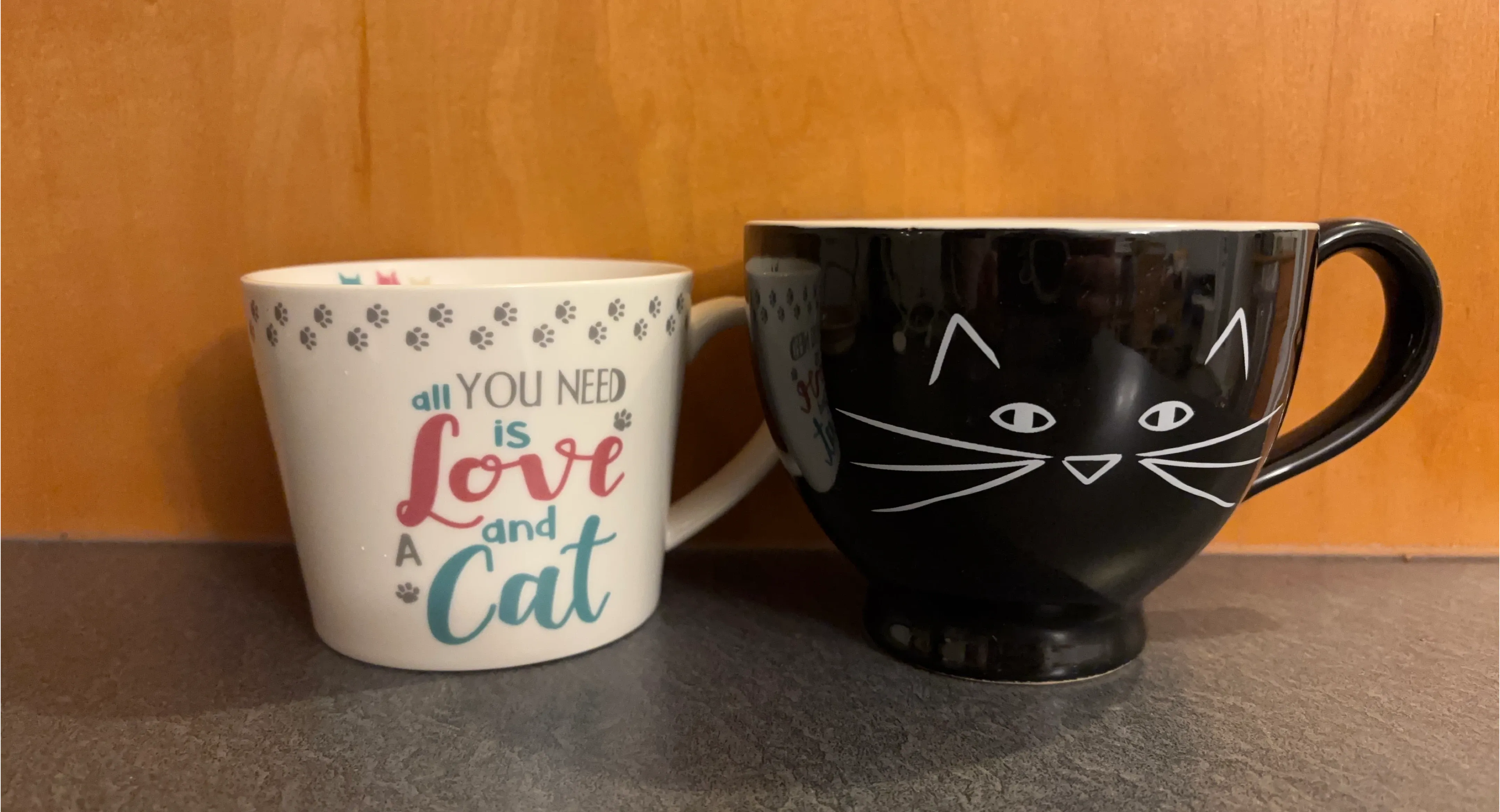 Selling a set of two cute mugs! One is a Cooksmart mug with a fun design, and the other is a black mug with a cat face design. Both are in great shape and ready for your favourite hot beverage