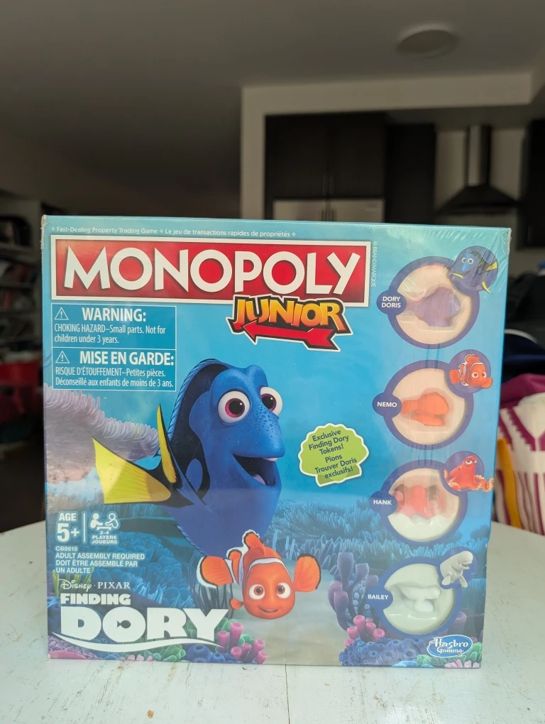Selling a Monopoly Junior board game, Finding Dory edition! It's a fast-dealing property trading game perfect for kids aged 5+. It requires adult assembly. The game includes exclusive Finding Dory tokens!
