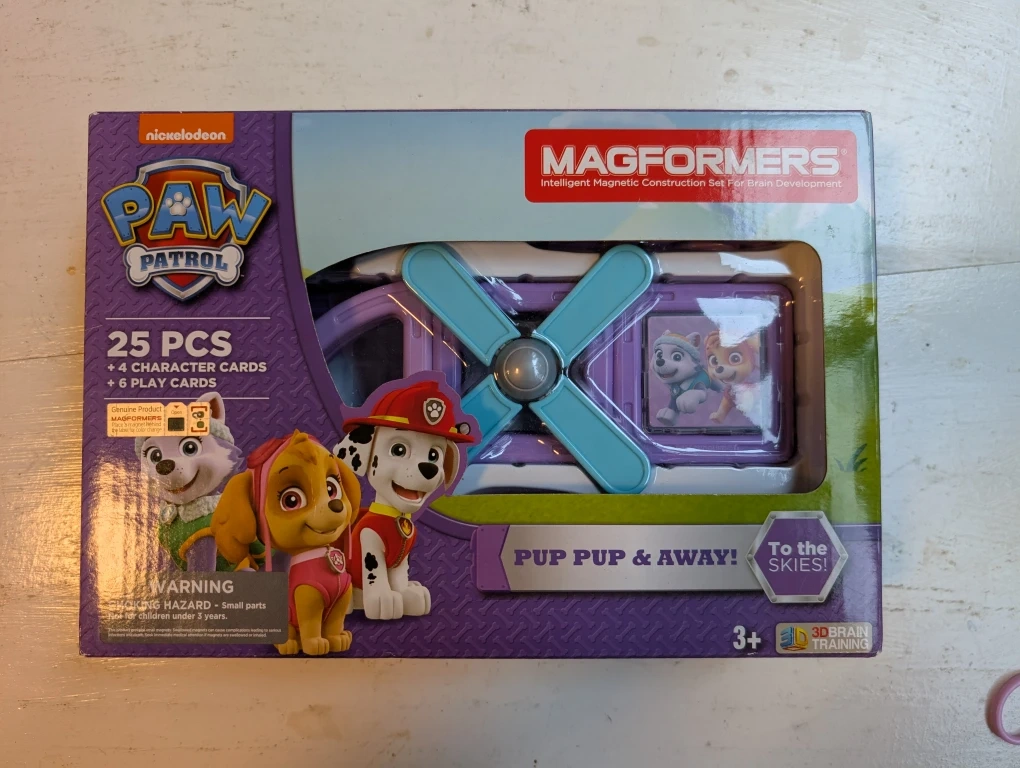 Selling a brand new Magformers Paw Patrol Pup Pup & Away set! It's an intelligent magnetic construction set designed for brain development. The set includes 25 pieces, 4 character cards, and 6 play cards. Perfect for kids aged 3+!