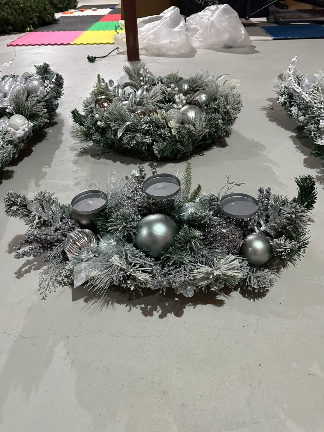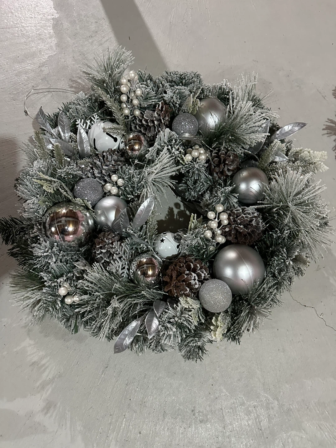 Selling a lovely set of silver Christmas decorations! Includes a wreath, a garland, and a centerpiece. Great for adding some sparkle to your holiday decor