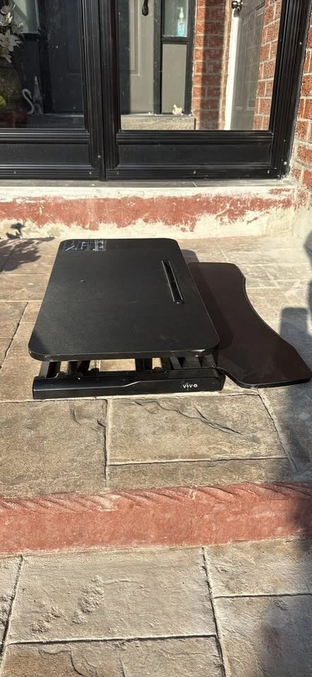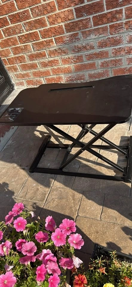 Retractable standing desk that sits ontop of a working platform. Can also use it to work from the floor as it provides a nice desk for working. Pistons are easy engageable and of high quality.