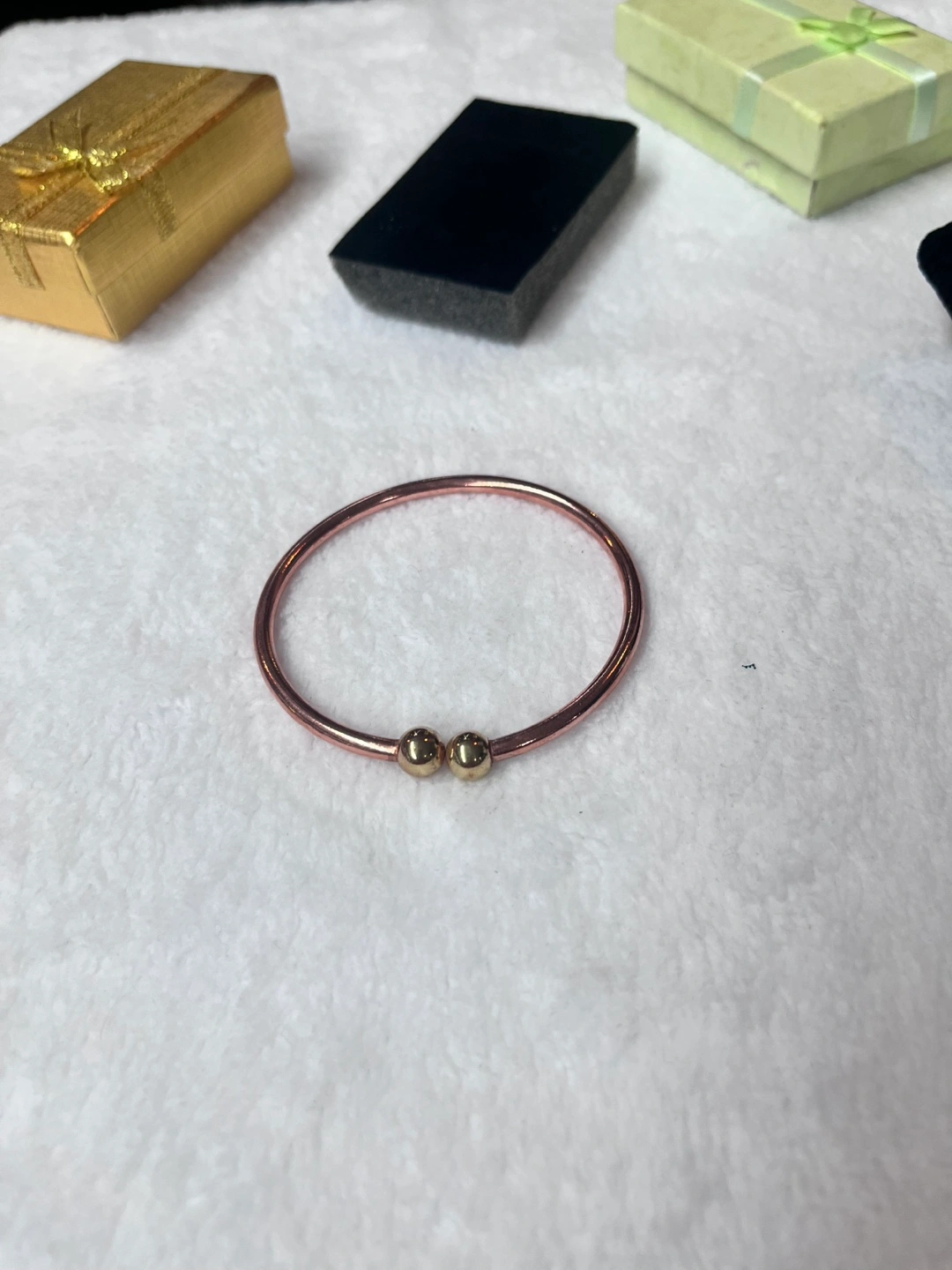 This is a simple and elegant rose gold bangle bracelet with two gold beads. It's in great condition and ready to wear! Brasalete de Cobre