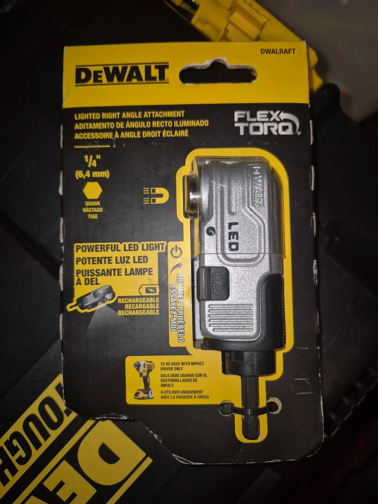 I'm selling a brand new DeWalt Lighted Right Angle Attachment. It features a powerful LED light and a 1/4" (6.4 mm) shank. It's rechargeable and includes a USB cable. This is a great tool to use with an impact driver!