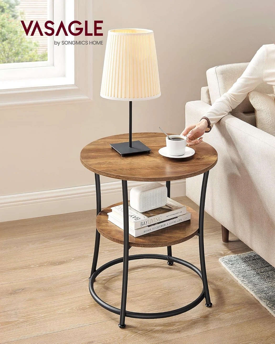 Side Table, 2-Tier Round End Table, Nightstand with Steel Frame for Small Spaces, Living Room, Bedroom, Honey Brown and Ink Black