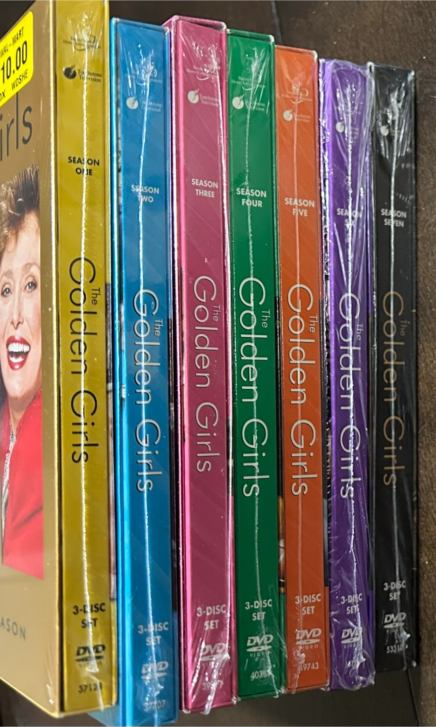 Selling the complete DVD set of The Golden Girls, featuring all seven seasons! Each season comes in its original packaging and includes a 3-disc set. All seasons are still sealed. Would make a great gift!